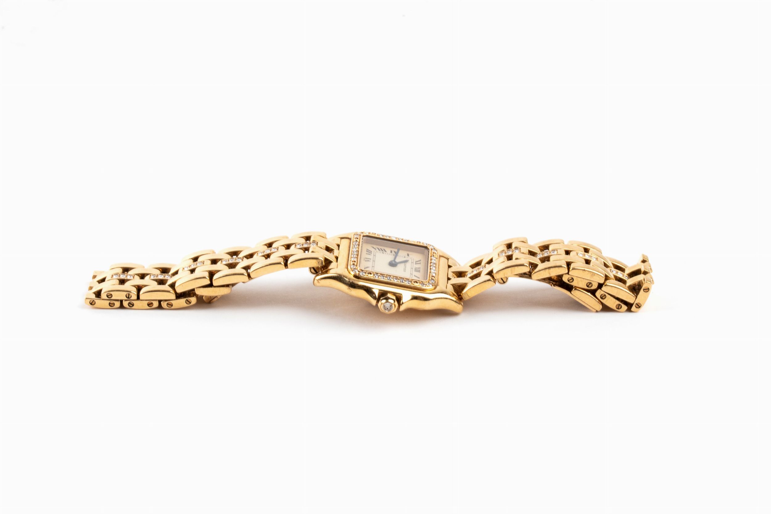 cassa in oro con contorno di diamanti, quadrante argentato, lancette a forma di gladio d'acciaio azzurrato e indici romani. Movimento al quarzo e diamante taglio brillante sulla corona. Sul fondello 01257, 8057915. Dimensione cassa: 36 x 27 mm. Peso complessivo lordo: 70,8 gr.