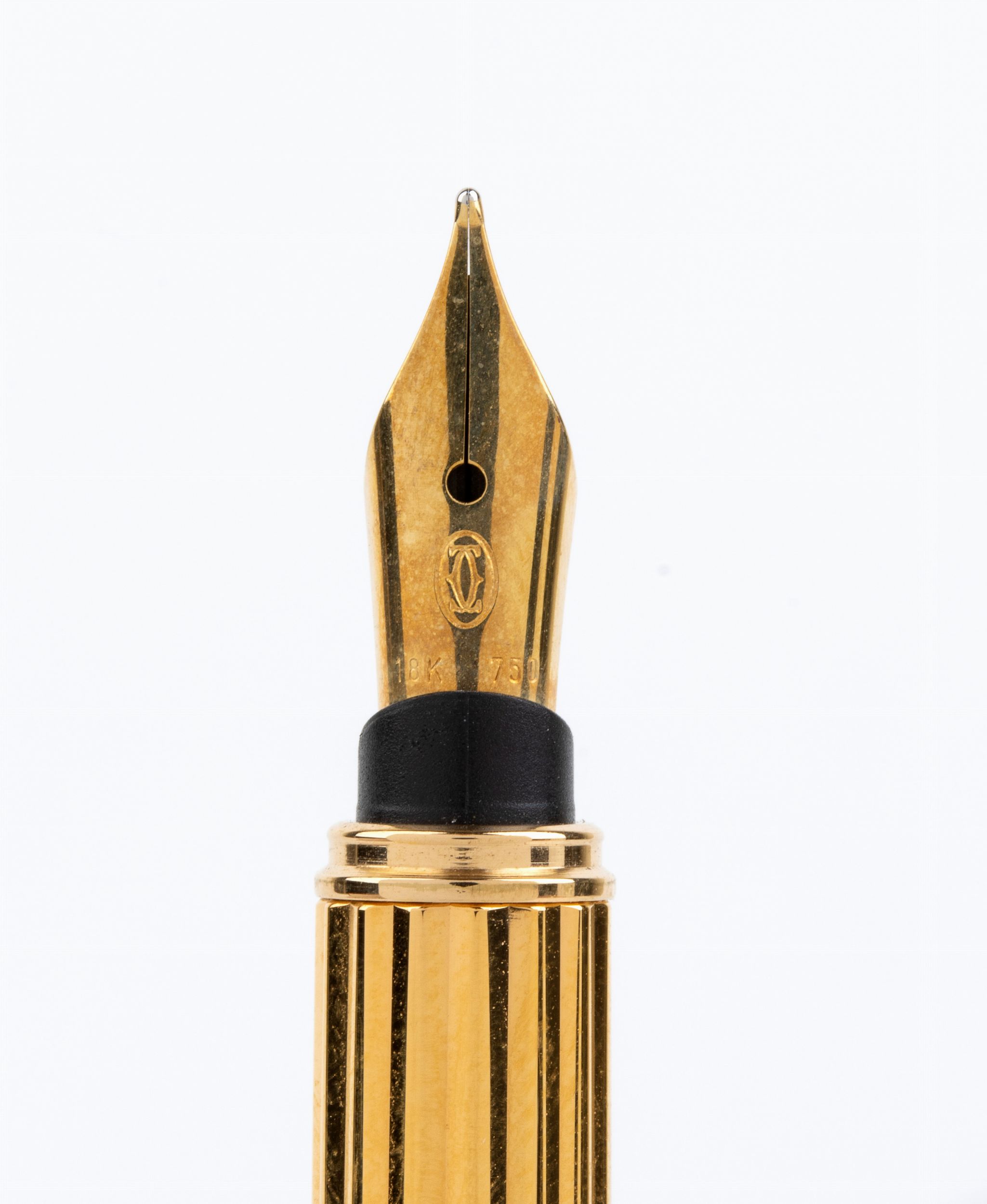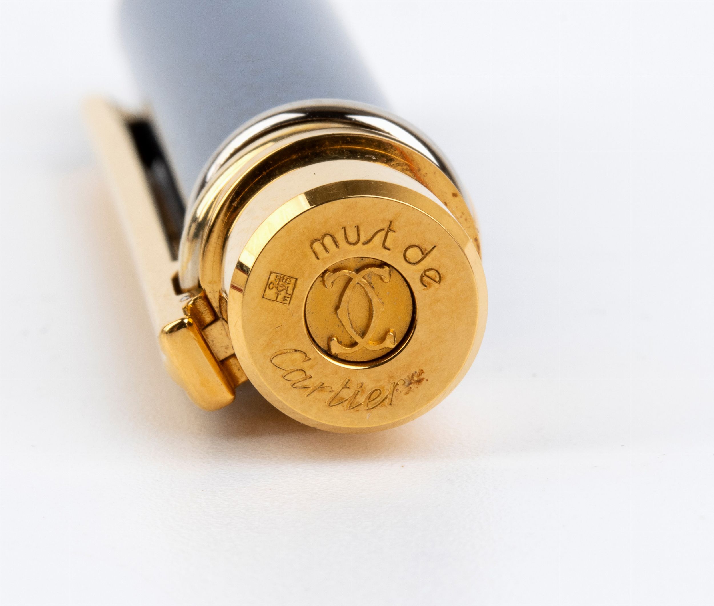 Corpo e cappuccio blu con clip e dettagli placcati in oro, pennino rodiato in oro 18k riportante la dicitura '18K - 750 - logo Cartier'. Numero seriale B36969. Lunghezza 13,7 cm . Peso 29,7 gr. Scatola e documenti originali Cartier.