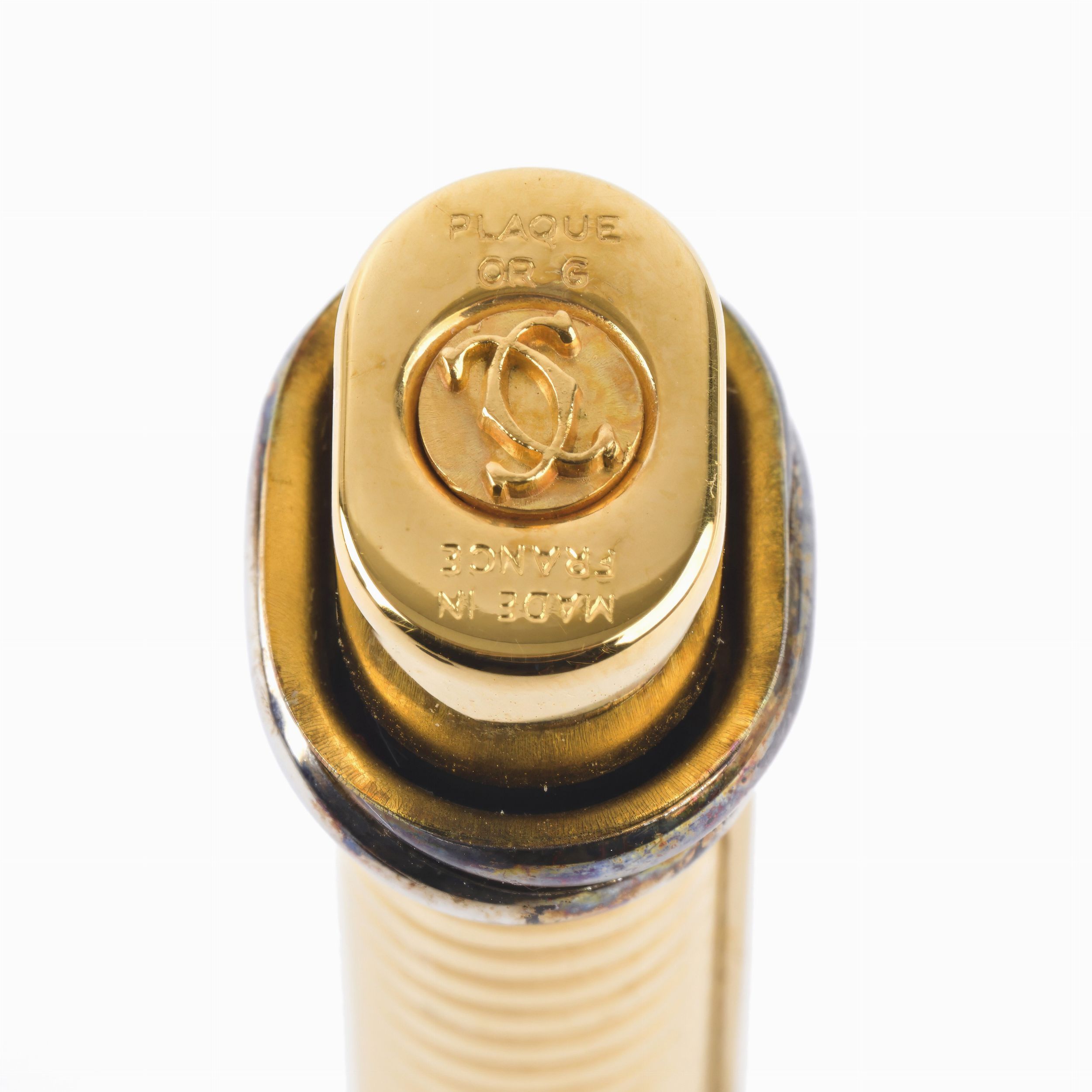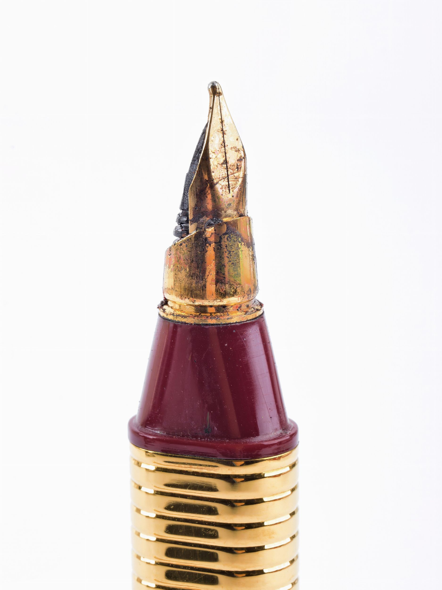 corpo e cappuccio placcati in oro; premendo la parte superiore del cappuccio la clip si apre alla larghezza desiderata, rilasciando la pressione la clip ritorna nella sua posizione originale. Numero di serie 123596. Accompagnata da scatola originale, contro scatola, documenti e refill. Lunghezza: 13,5 cm. Peso: 24 gr.