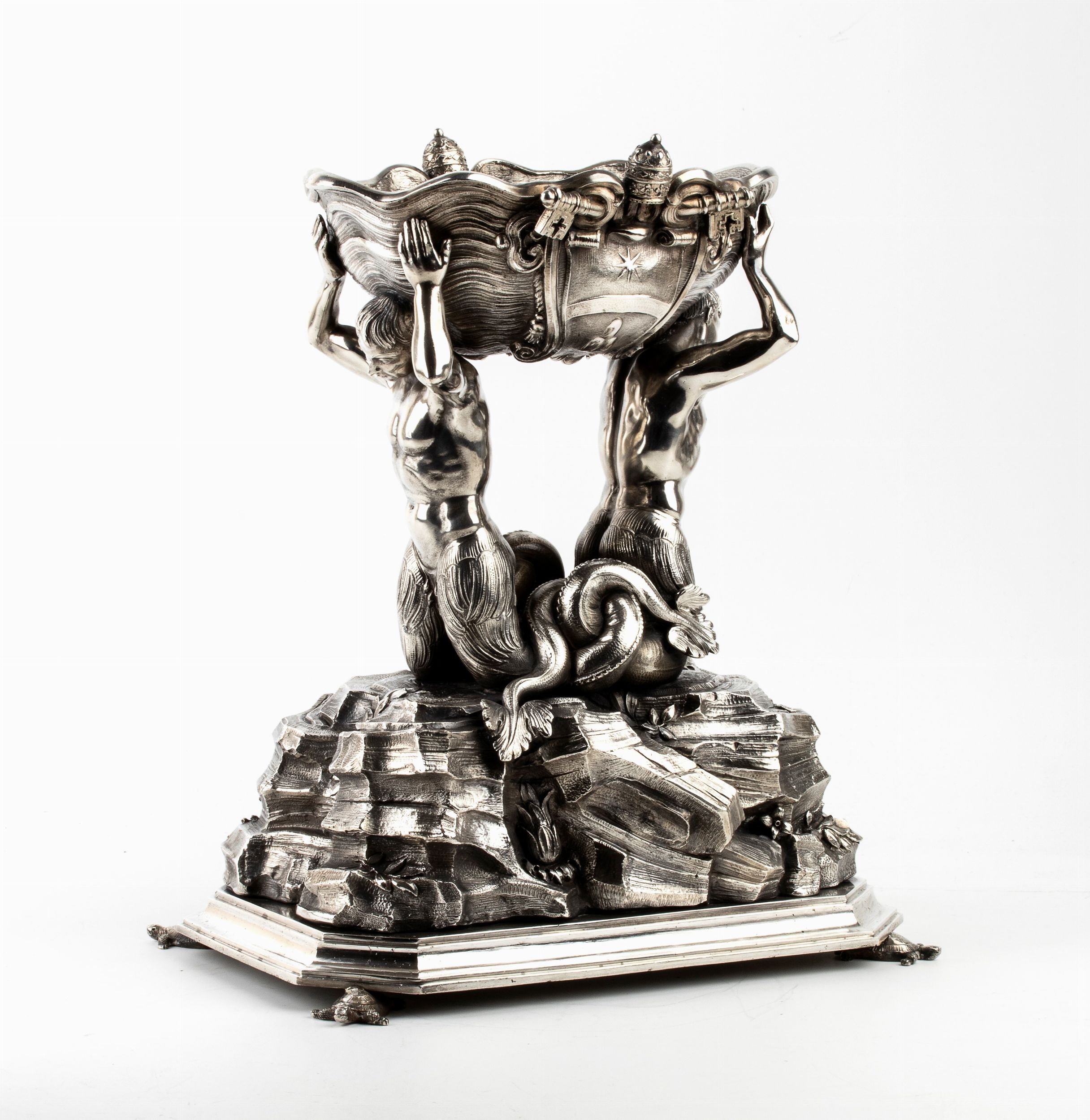 Altezza x larghezza x profondità: 32,5 x 26,5x 17,50 cm. Peso 6180 Roma, metà XX secolo Realizzata in fusione a cera persa da Marcello Mortet in argento 800/1000, punzonata '800' e 'ROMA'. La fontana, situata in Piazza della Bocca della Verità in Roma fu realizzata da Carlo Bizzaccheri su commissione di papa Clemente XI, fu posta nella piazza nel 1715; ha base ottagonale e rappresenta due tritoni che sorreggono una conchiglia sopra le teste da cui sgorga l'acqua. Qui fino al 1868 venivano eseguite le condanne a morte.
