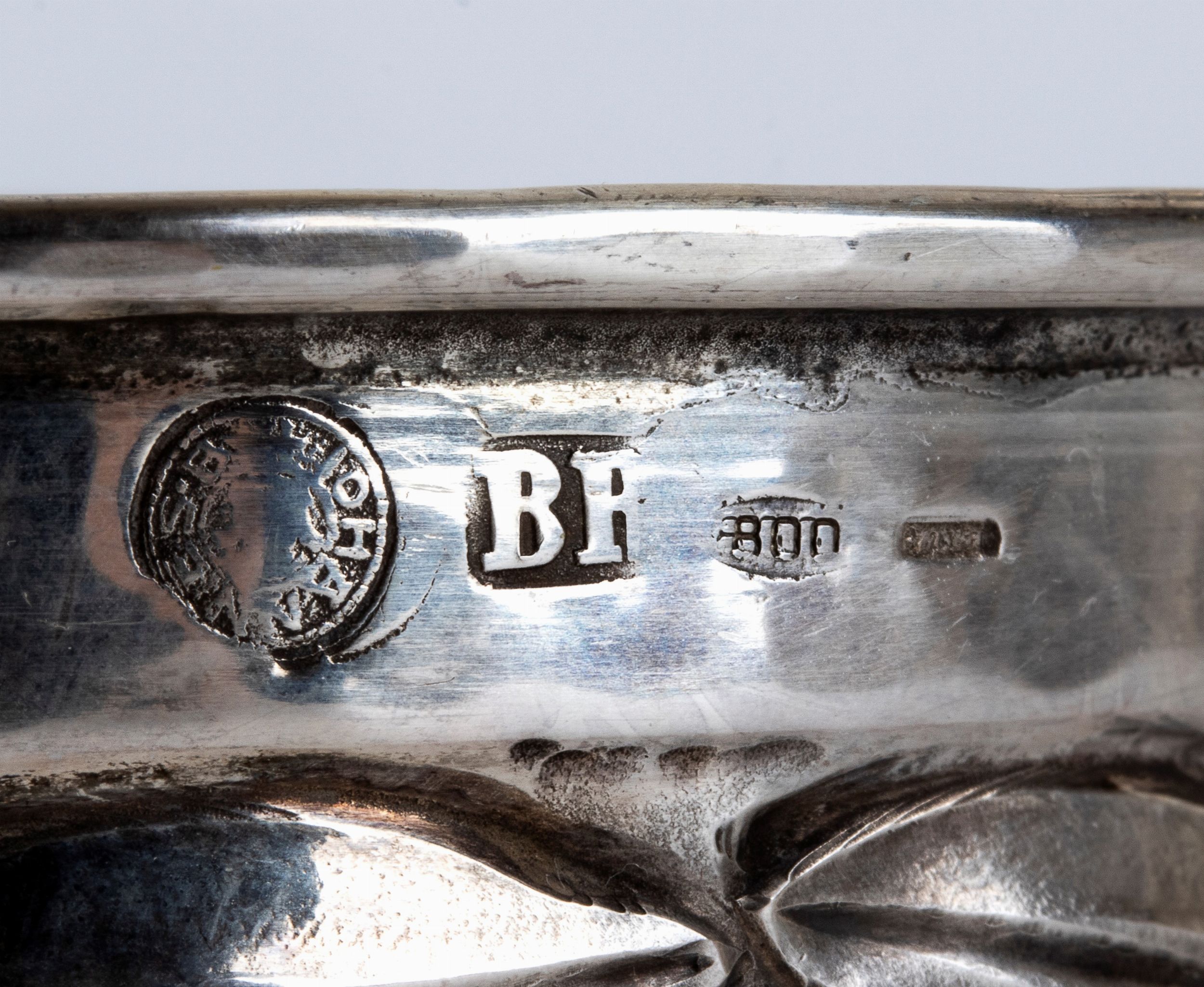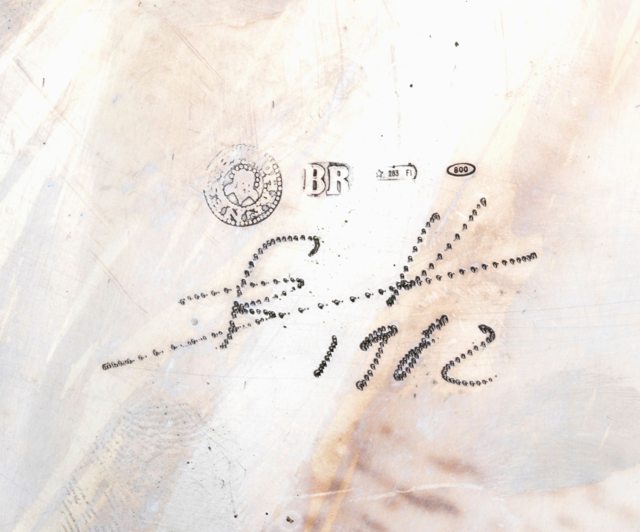Firenze, XX secolo composto da 12 piatti di forma rotonda decorati da motivi di foglie, fiori e bacche, 12 coppette con medesime decorazioni e 12 bicchieri a forma di calice raffiguranti piante e fiori e un muso di gatto su uno dei bicchieri, in onore del committente. Argento 800/1000, punzonati 'BR - 800 - 283 FI', argentoioere BRANDIMARTE, compresa firma autografa di Brandimarte sotto piatti e coppette. Diametro piatti: 30 cm; dimensioni bicchieri: 14,5 x 8,5 x 8,5 cm; dimensioni coppette: 5 x 9 x 9 cm.