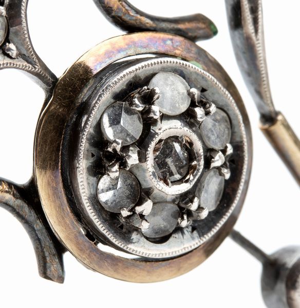 fine XIX secolo a motivo di volute di nastri con rosone centrale e dettagli in diamanti taglio a rosa. Dimensioni: 5 x 3,5 cm . Peso: 7,5 gr.
