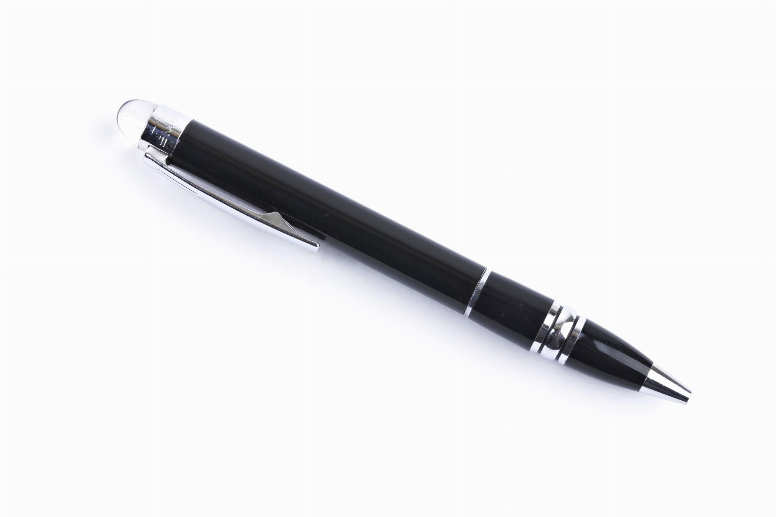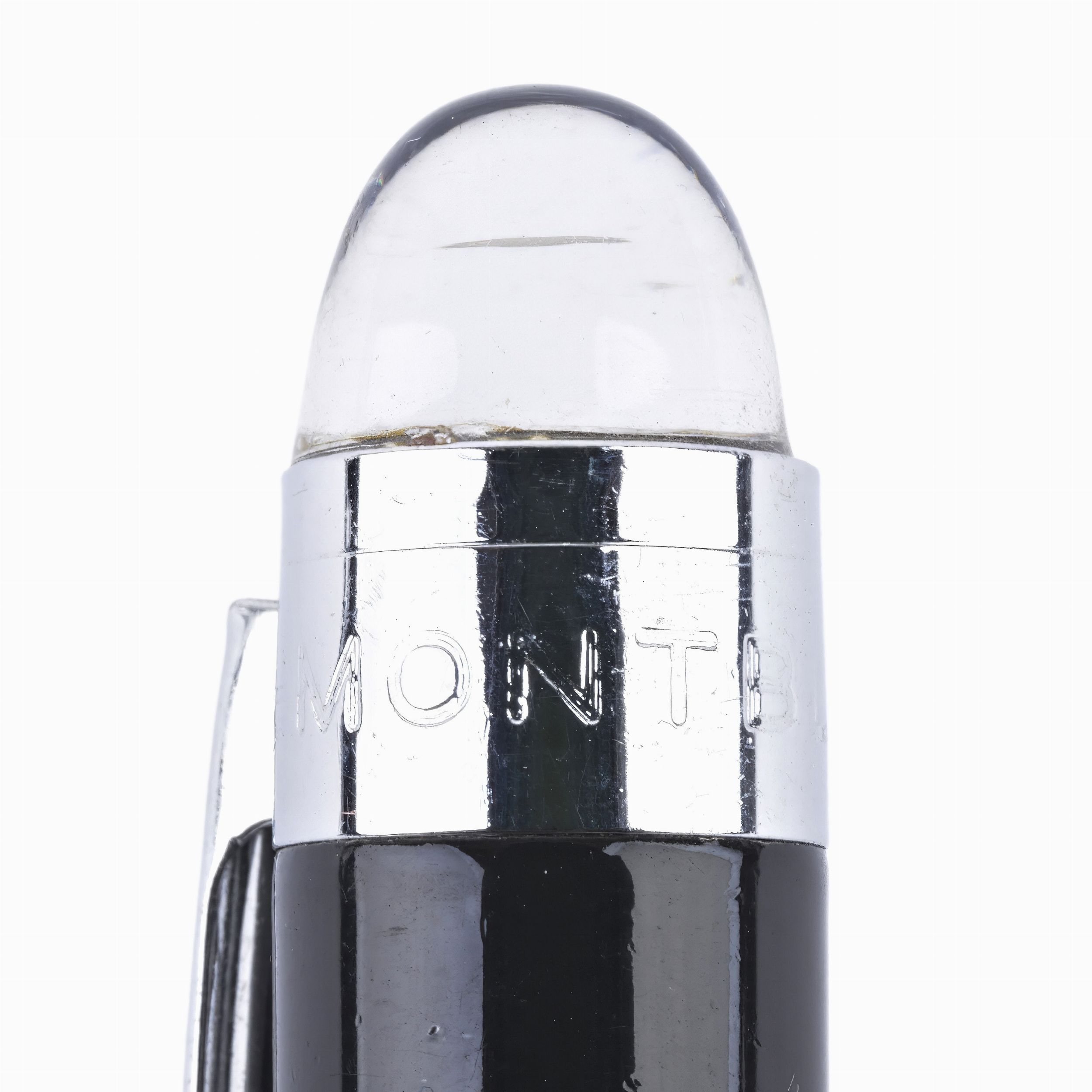 corpo in pregiata resina nera, stella bianca Montblanc fluttuante inserita in una cupola in resina trasparente, finiture e clip in acciaio cromato. Lunghezza: 14 cm. Peso: 20,3 gr.