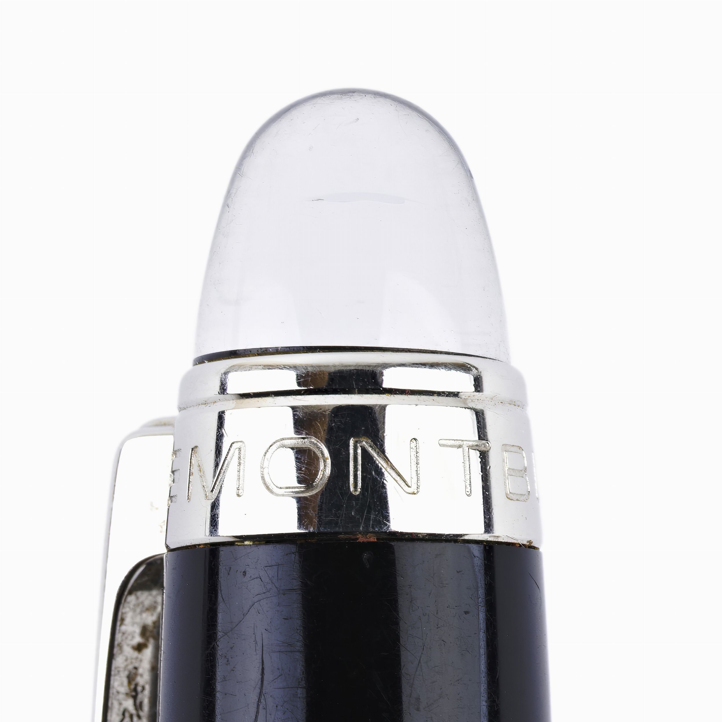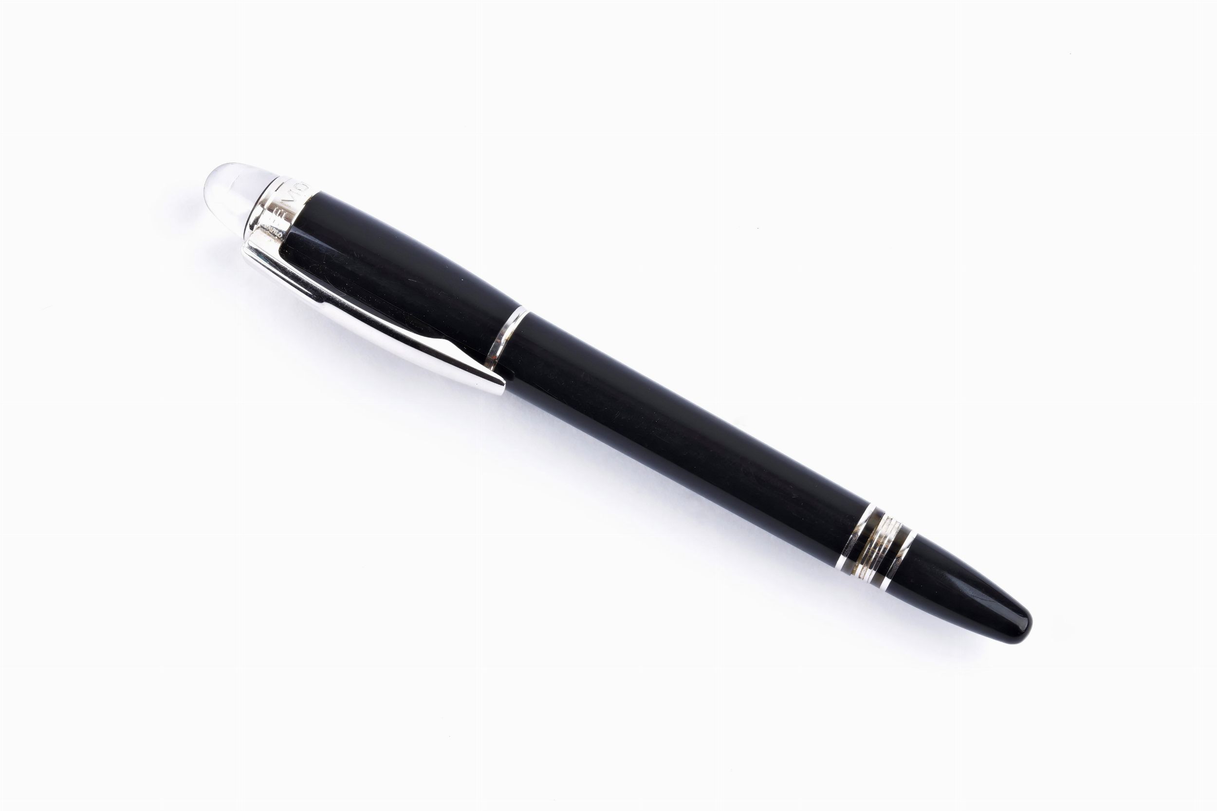 corpo in pregiata resina nera, stella bianca Montblanc fluttuante inserita in una cupola in resina trasparente, finiture e clip in acciaio cromato. Lunghezza: 14 cm. Peso: 32,9 gr.