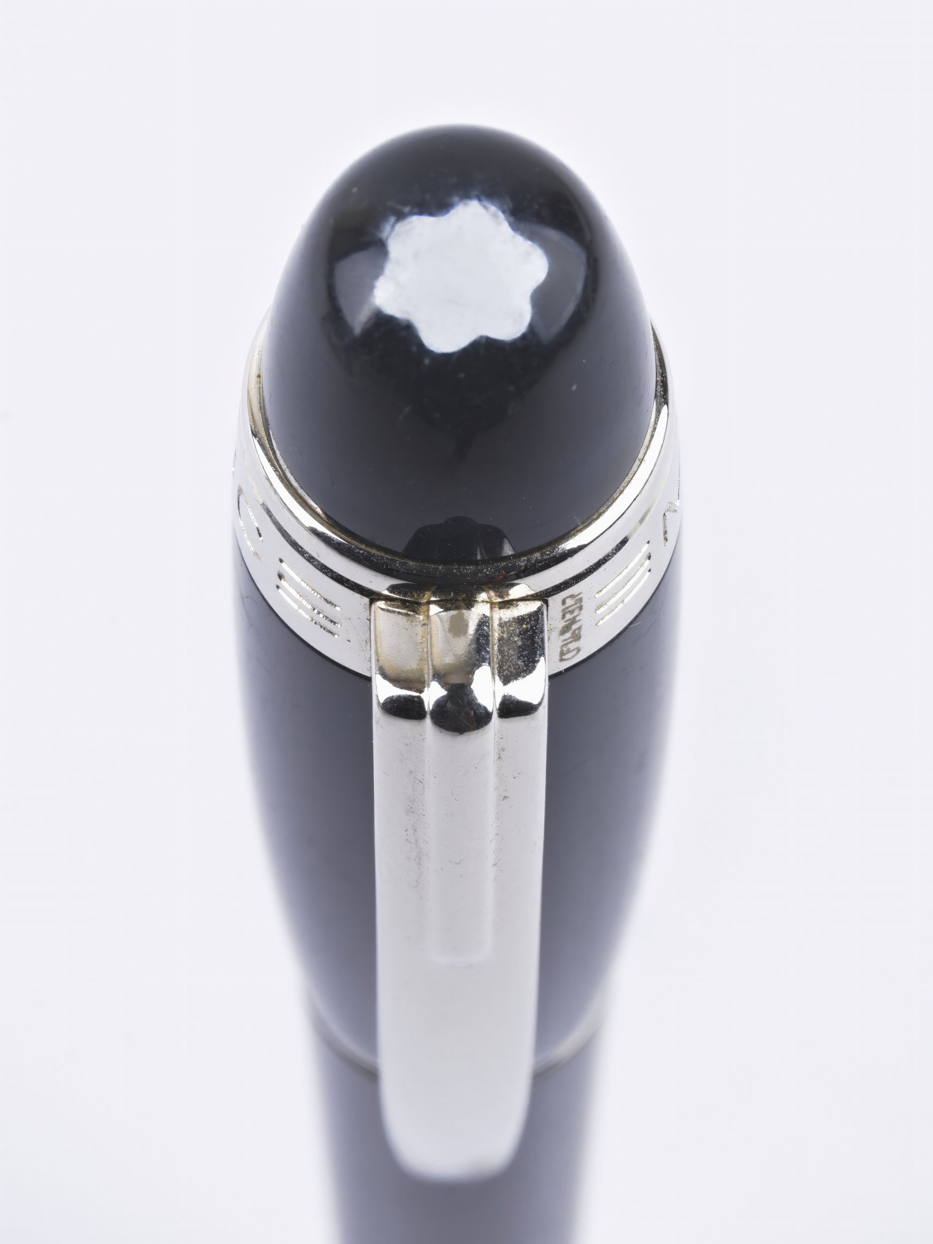 corpo in pregiata resina nera, stella bianca Montblanc fluttuante inserita in una cupola in resina trasparente, finiture e clip in acciaio cromato. Lunghezza: 14 cm. Peso: 32,9 gr.