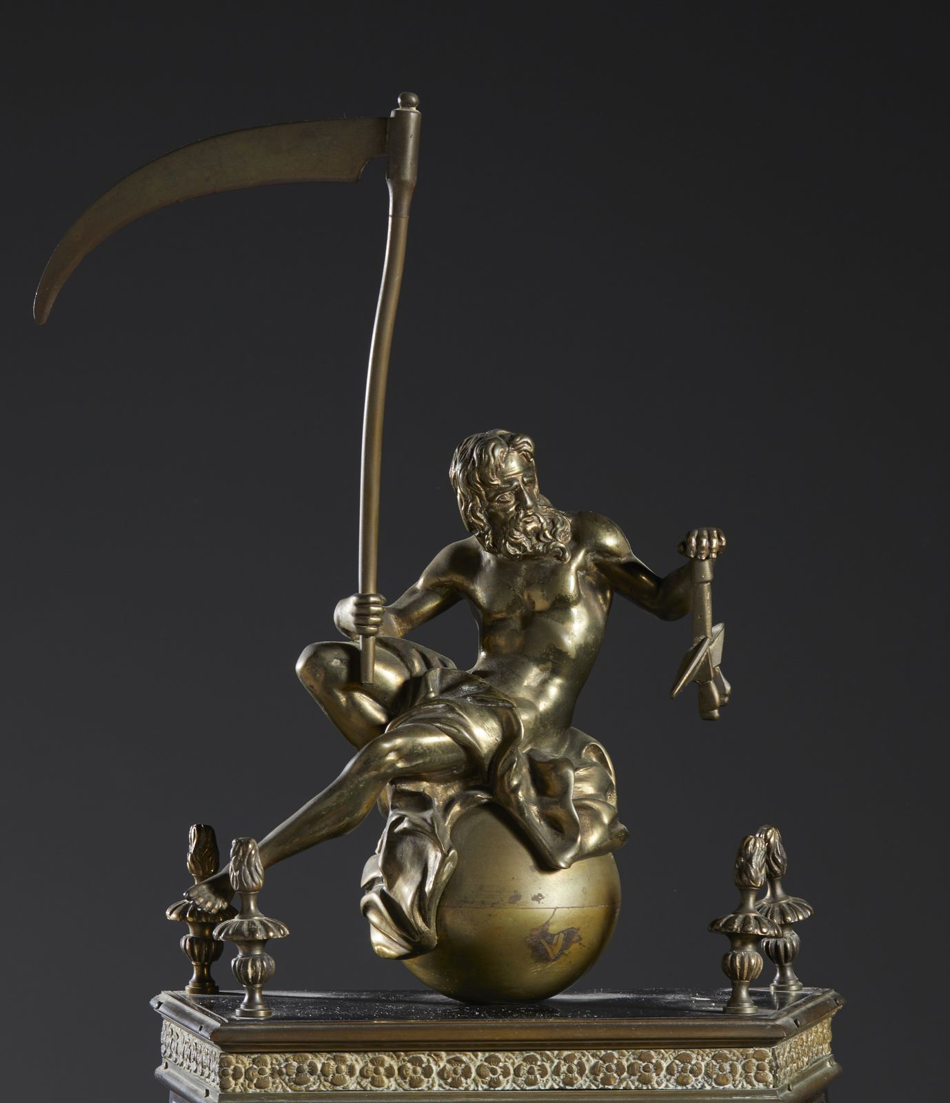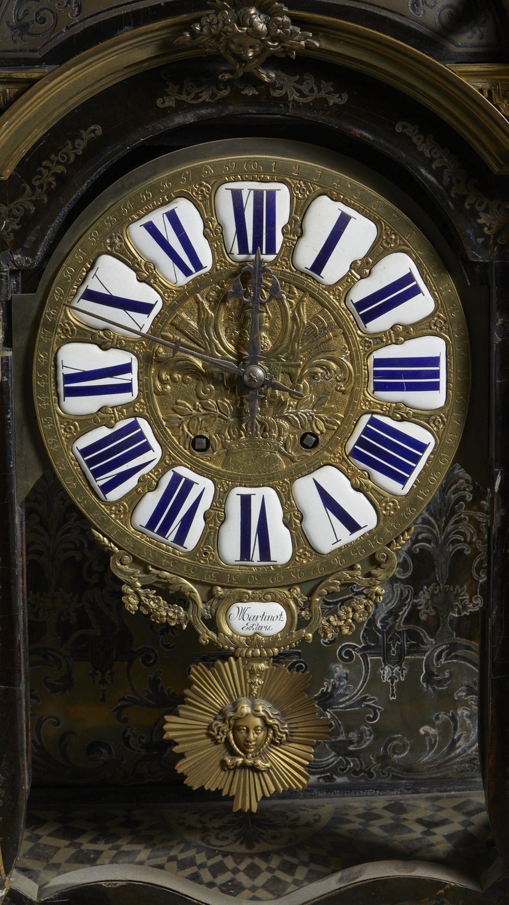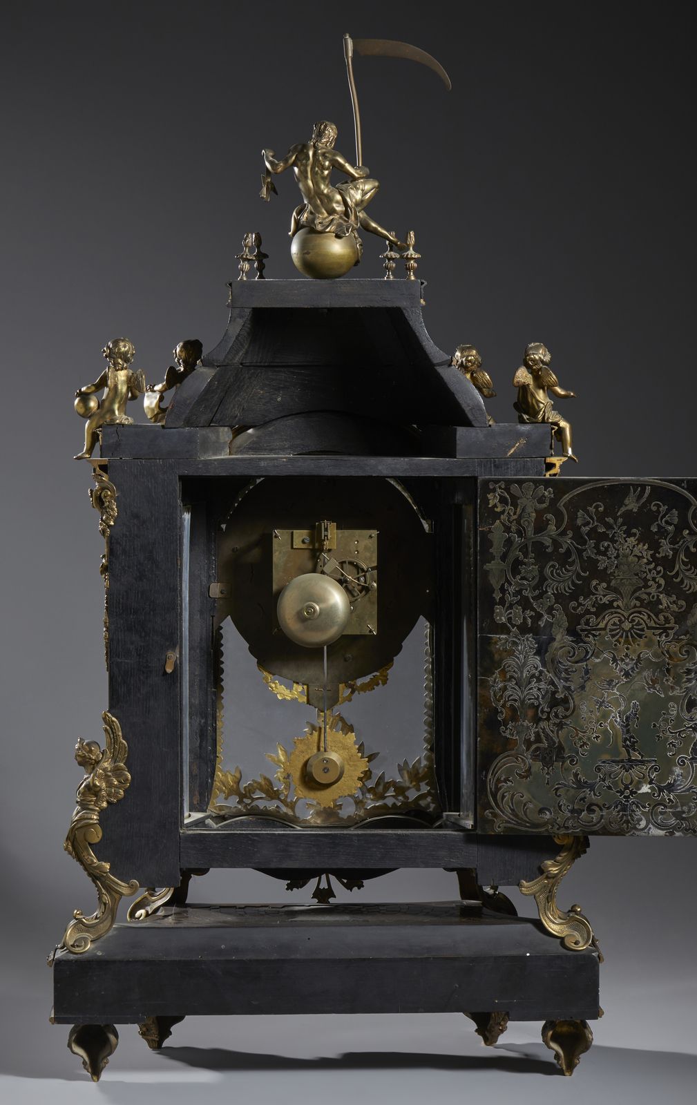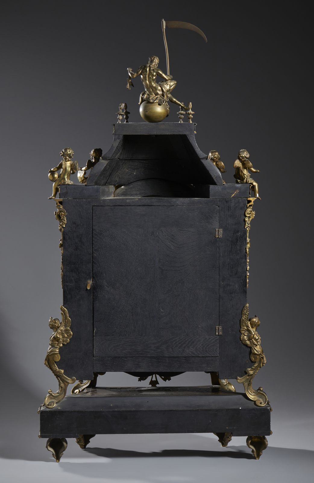 Grande orologio da tavolo in stile Boulle, in legno ebanizzato intarsiato in metallo [..]