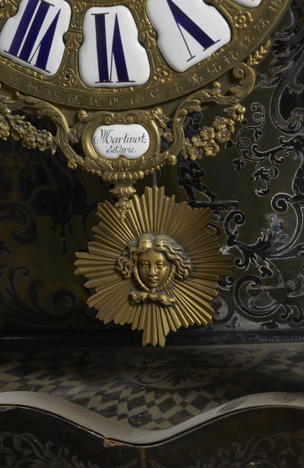 Quadrante in lamina di metallo dorato con numeri romani su smalto bianco, firmato 'Martinot Paris'.