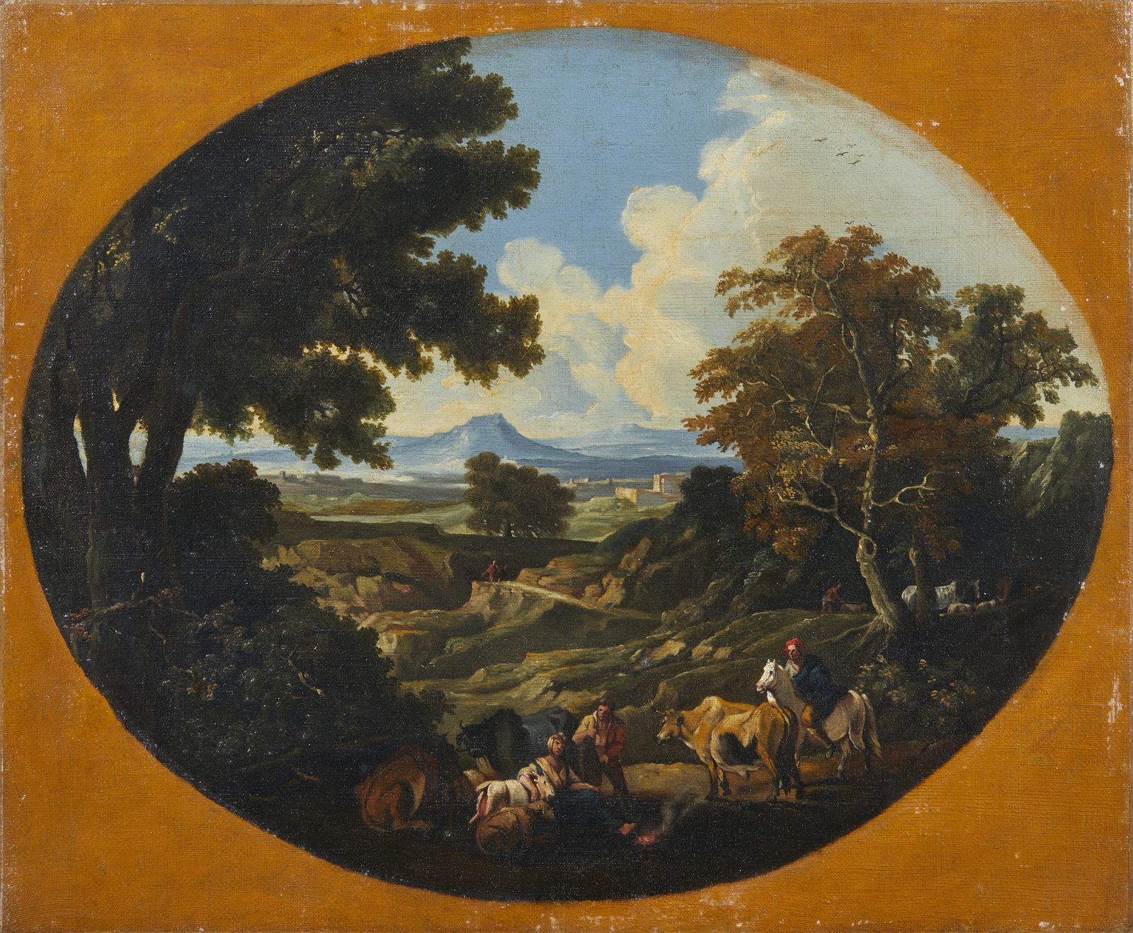 Dimensioni paesaggio ovale: 49,5x62 cm.Provenienza:Collezione privata lombarda.L'opera risulta essere una replica, con minime varianti e di dimensioni analoghe, di una tela raffigurante lo stesso soggetto conservata presso il Musée des Beaux-Arts di Carcassonne, Francia (inv. 845.1.23).