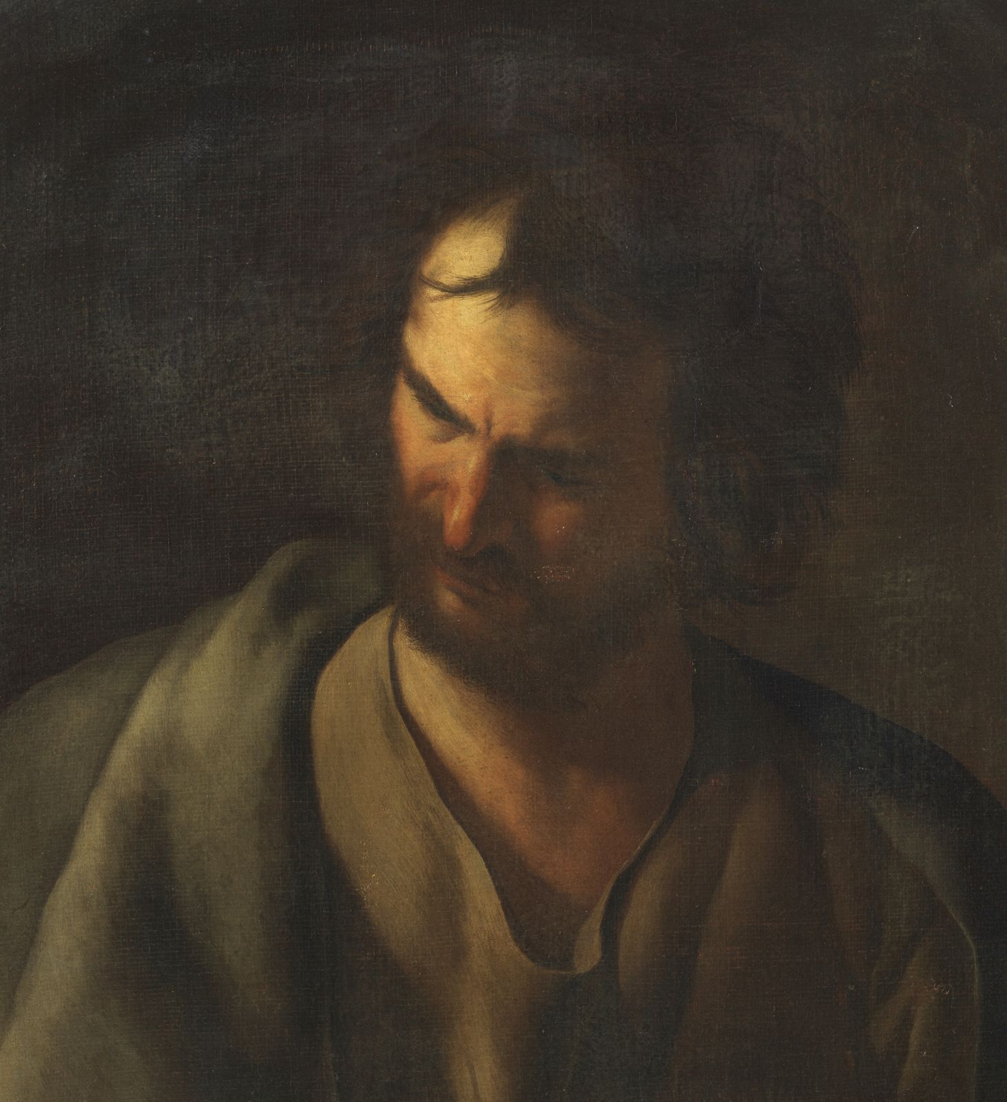 Provenienza: Collezione Gilberto Algranti, Milano nel 1969.Collezione privata milanese. Collezione Francesco Romano, Roma nel 1973. Collezione privata, Milano.Bibliografia: A. Percy, Bernardo Cavallino of Naples 1616-1656. The Cleveland Museum of Art 1984, pp. 112 e 114, fig. 30-31b (come Santo in preghiera).Nicola Spinosa, Bernardo Cavallino1616-1656, Electa Napoli, 1985, pp. 122-123, fig. A21-22b.Nicola Spinosa, Grazia e tenerezza in posa, Bernardo Cavallino e il suo tempo, Ugo Bozzi Editore, Roma, 2013, p. 323.Da un fondo scuro indistinto, emerge una mezza figura maschile, un santo che si mostra allo spettatore non nello splendore della sua iconografia classica, ma come un uomo comune, avvolto in un manto i cui drappeggi quasi inglobano la forma del corpo, lasciando emergere le mani, appena giunte, con le dita realisticamente appoggiate le une alle altre come in un momento di riflessione: lo sguardo, pensoso, è diretto verso la propria destra, lato da cui ha origine una fonte di luce che irradia l’opera in modo soffuso. Una figura austera, che sembra quasi emergere dalle tenebre, con pochi elementi, all’apparenza, che possano indicarci la sua santità. Come da tradizione caravaggesca, poi magistralmente rielaborata da Jusepe De Ribera, alla cui lezione qui Cavallino sembra rifarsi esplicitamente, la forza estatica e al tempo stesso profondamente “vera” del corpo, dell’umanità delle figure, si impone sulla scena, superando, con la sua semplicità, ogni artificio retorico e ogni complessa allegoria. Bernardo Cavallino rappresenta in un certo modo la sintesi dei percorsi di questi suoi ideali “maestri”, a cui certamente va unito il nome imprescindibile di Massimo Stanzione, una sintesi che permetterà all’artista, nelle parole di Raffaello Causa, di “schiudere alla pittura napoletana il momento lirico della massima emozione”.Il dipinto qui presentato, già noto a Causa come una raffinata opera autografa di Cavallino (indicando, come soggetto, “San Giuseppe in preghiera”) e più volte pubblicato come tela di ubicazione non nota, è riconducibile a una serie eterogenea di altre ‘mezze figure’ di santi su tele di forma ottagonale, tra cui un “San Pietro” e un “San Paolo” di dimensioni maggiori (127x94 cm, già Londra, Spatford Establishment), e un “San Paolo”, un “San Giovanni Evangelista” e un “San Bartolomeo” su tele di forma e dimensioni simili alla nostra (il “San Paolo” già presso il Conte de Muguiro a Madrid). A queste si può aggiungere un “San Simone” (già presso I. e G. Fine Arts International, Londra), su tela ovale che però, sia stilisticamente che per dimensioni, fa supporre una riduzione a partire da una tela forse ottagonale come quella dell’opera in esame. Queste opere, databili agli inizi degli anni ’40 del XVII secolo, sono state poste in relazione diretta con la serie dei “profeti” di Jusepe De Ribera, eseguita tra il 1638 e il 1643 per la Chiesa della Certosa di San Martino a Napoli, ipotizzando forse un vero e proprio omaggio all’artista spagnolo, come avanzato da Nicola Spinosa. Il soggetto del dipinto in esame è stato poi successivamente indicato più precisamente come “San Giuda Taddeo”.