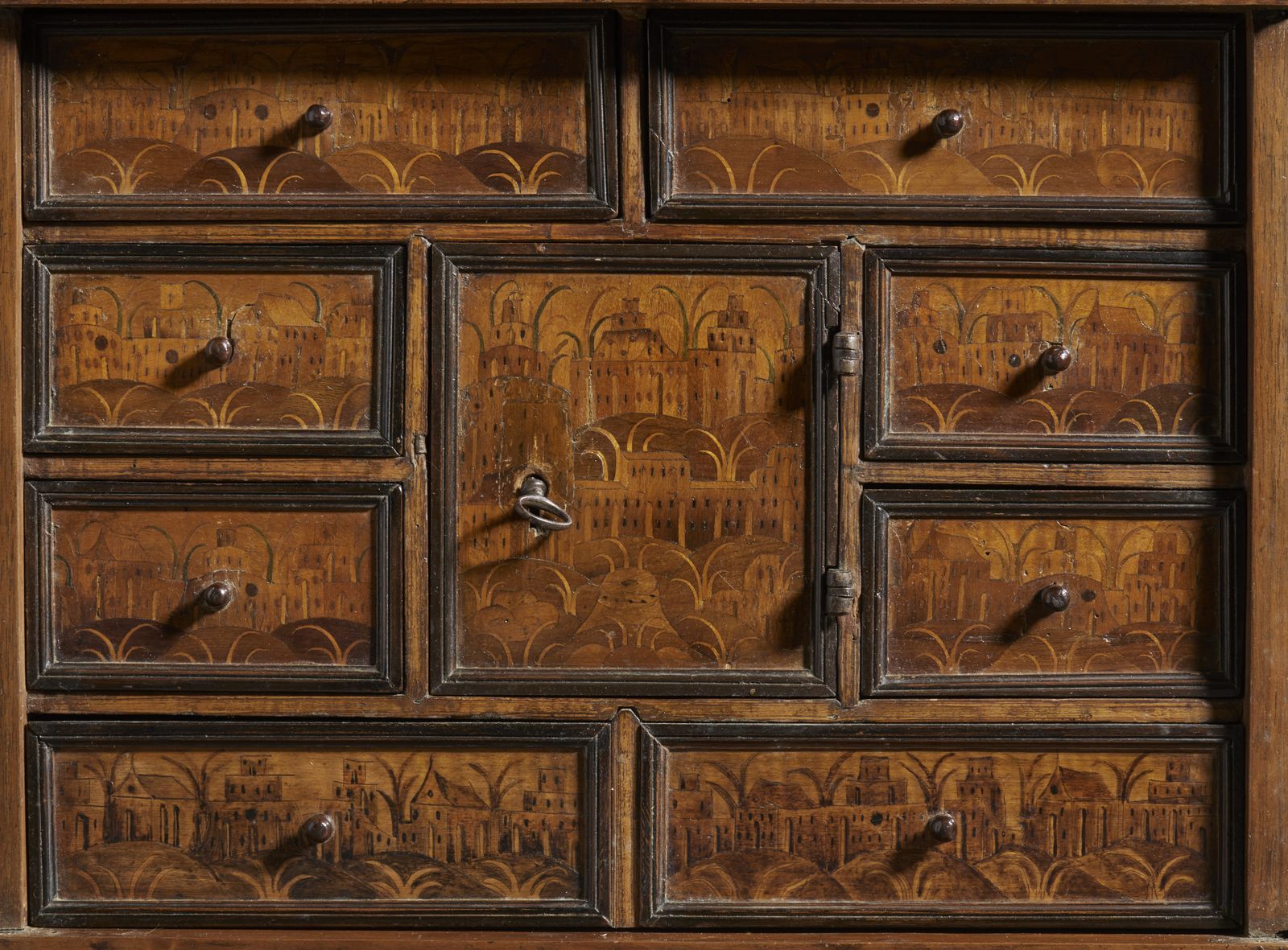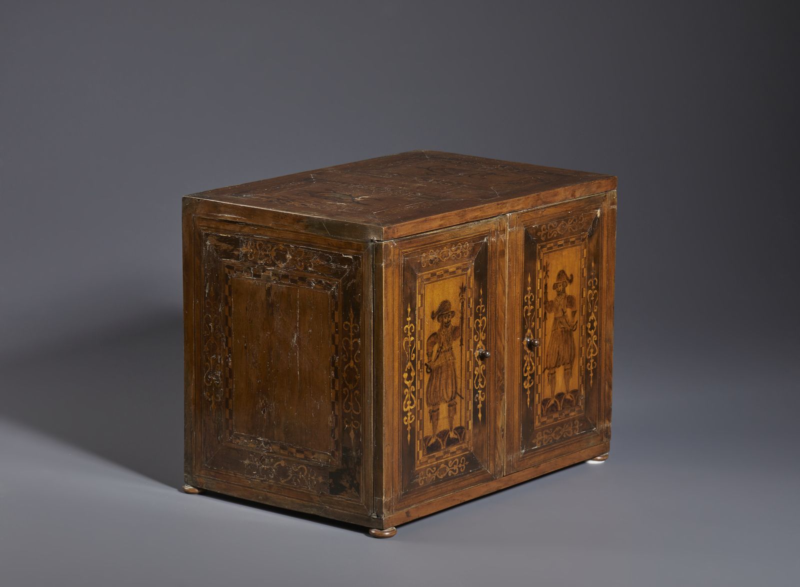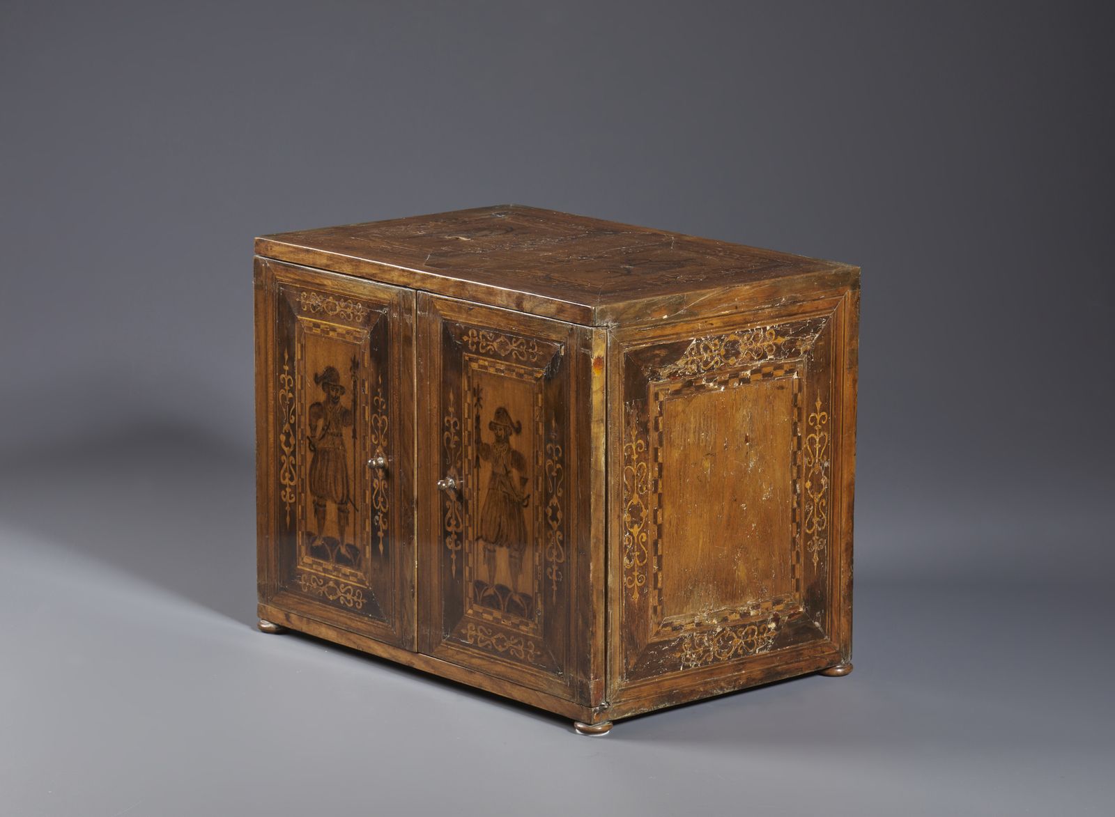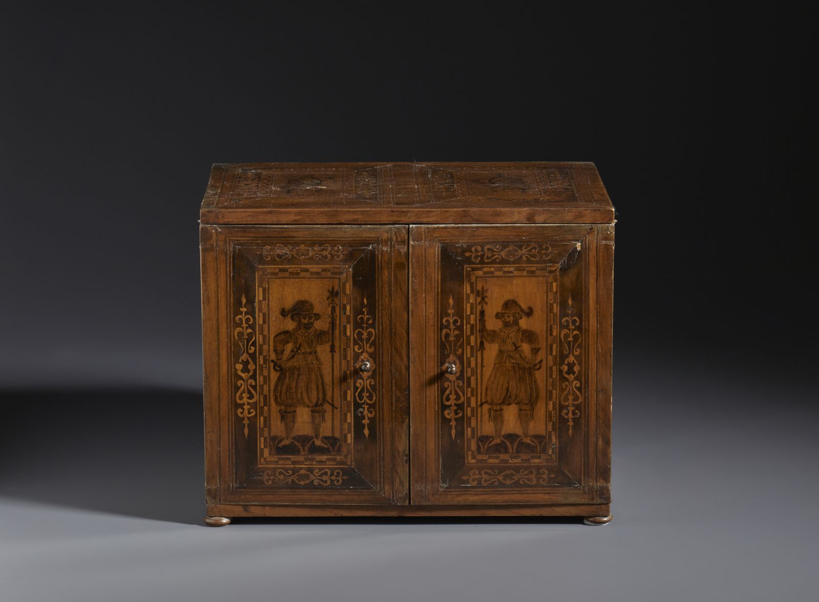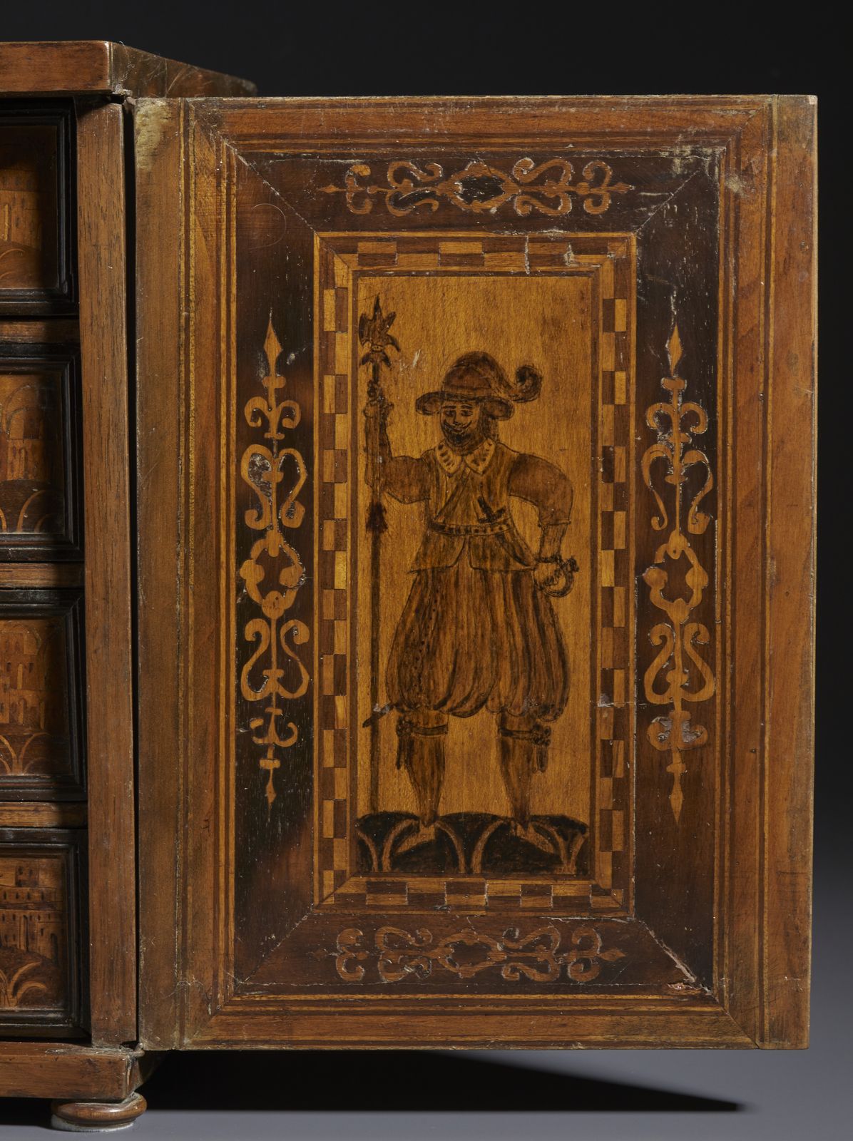 Stipo monetiere intarsiato in legni vari, fronte a doppia anta con figure di armigeri [..]