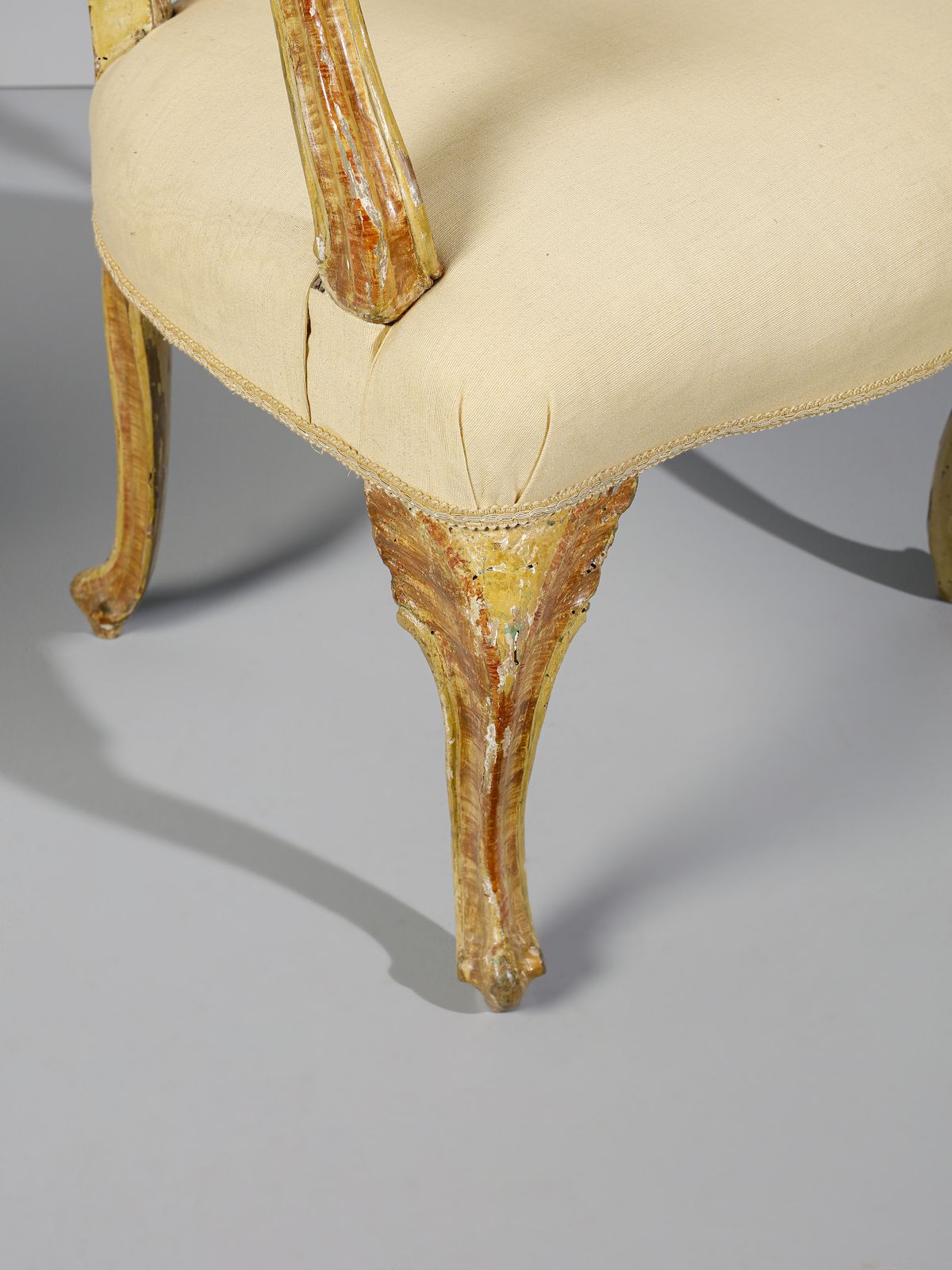 Tre poltrone in legno intagliato, laccato e dipinto nei toni del giallo e del bruno, [..]
