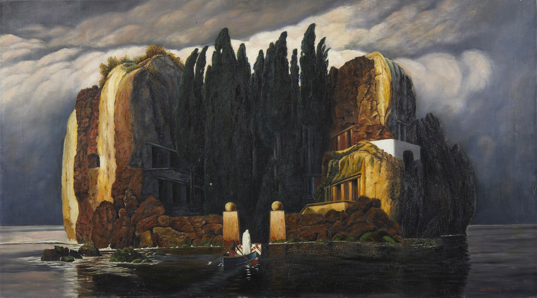 Firmato e datato in basso a destra.L'opera deriva dal dipinto di Arnold Böcklin L'isola dei morti del 1886, conservato al Museum der bildenden Künste di Lipsia e V versione del più celebre soggetto dell'artista.