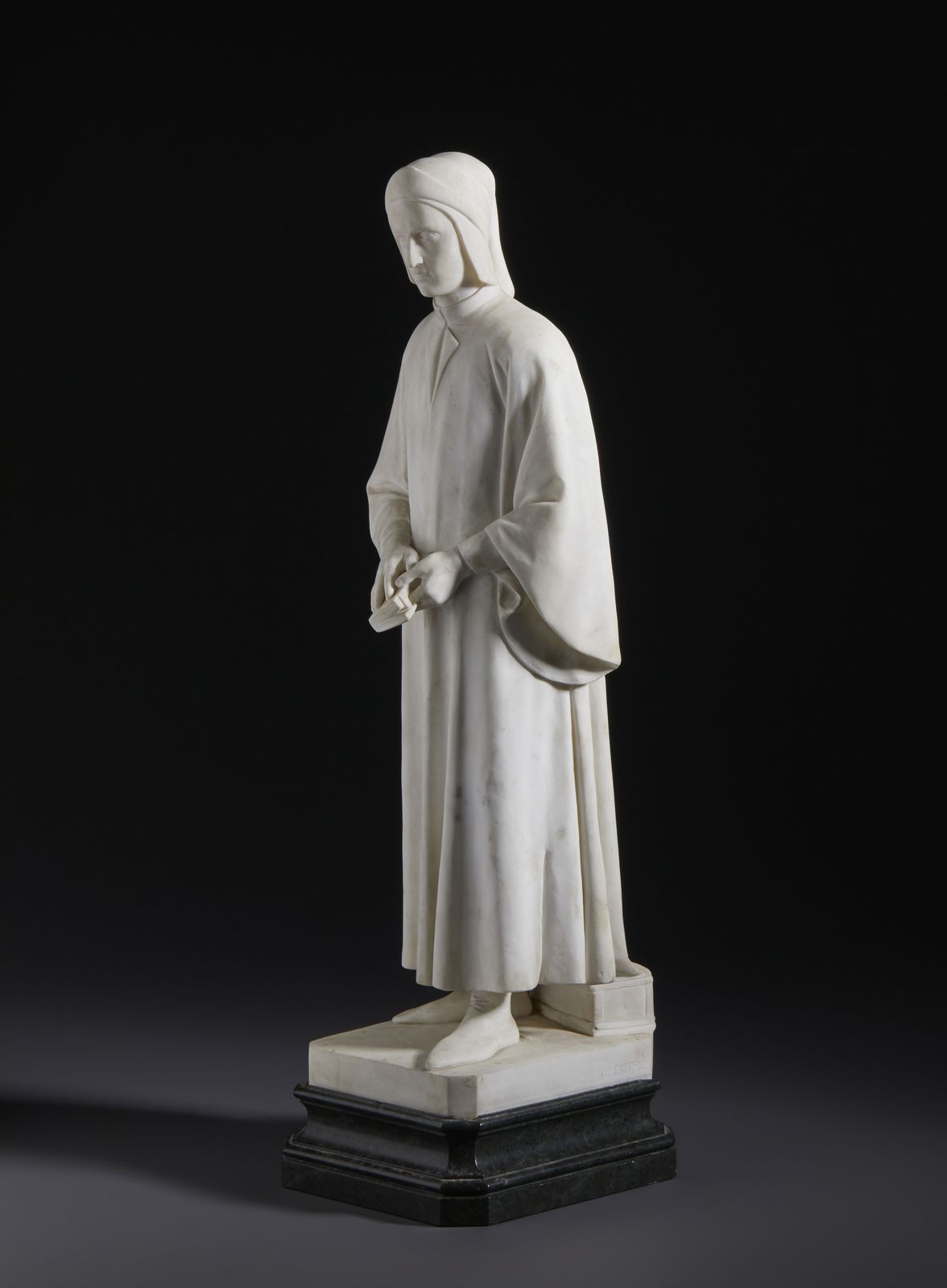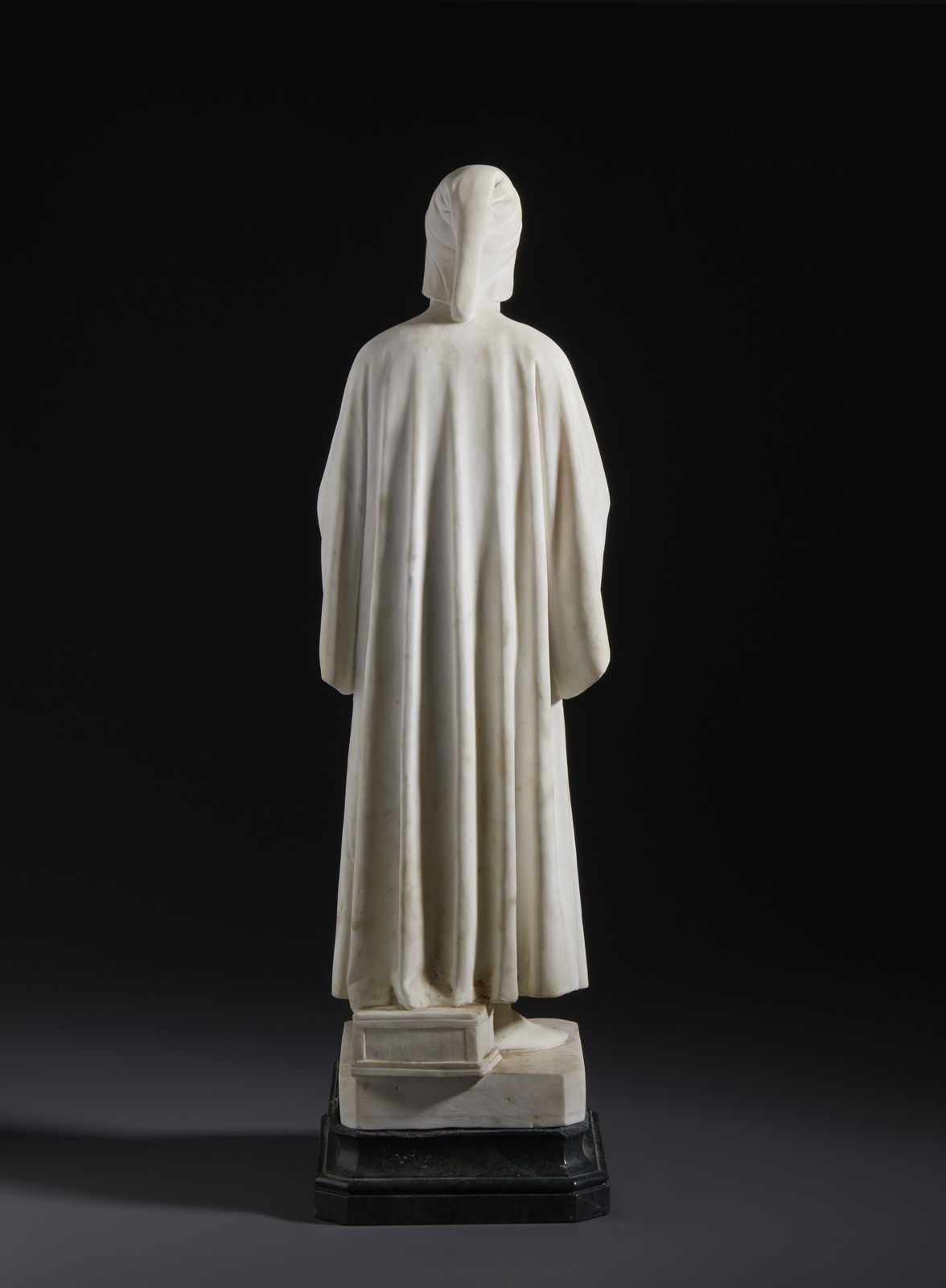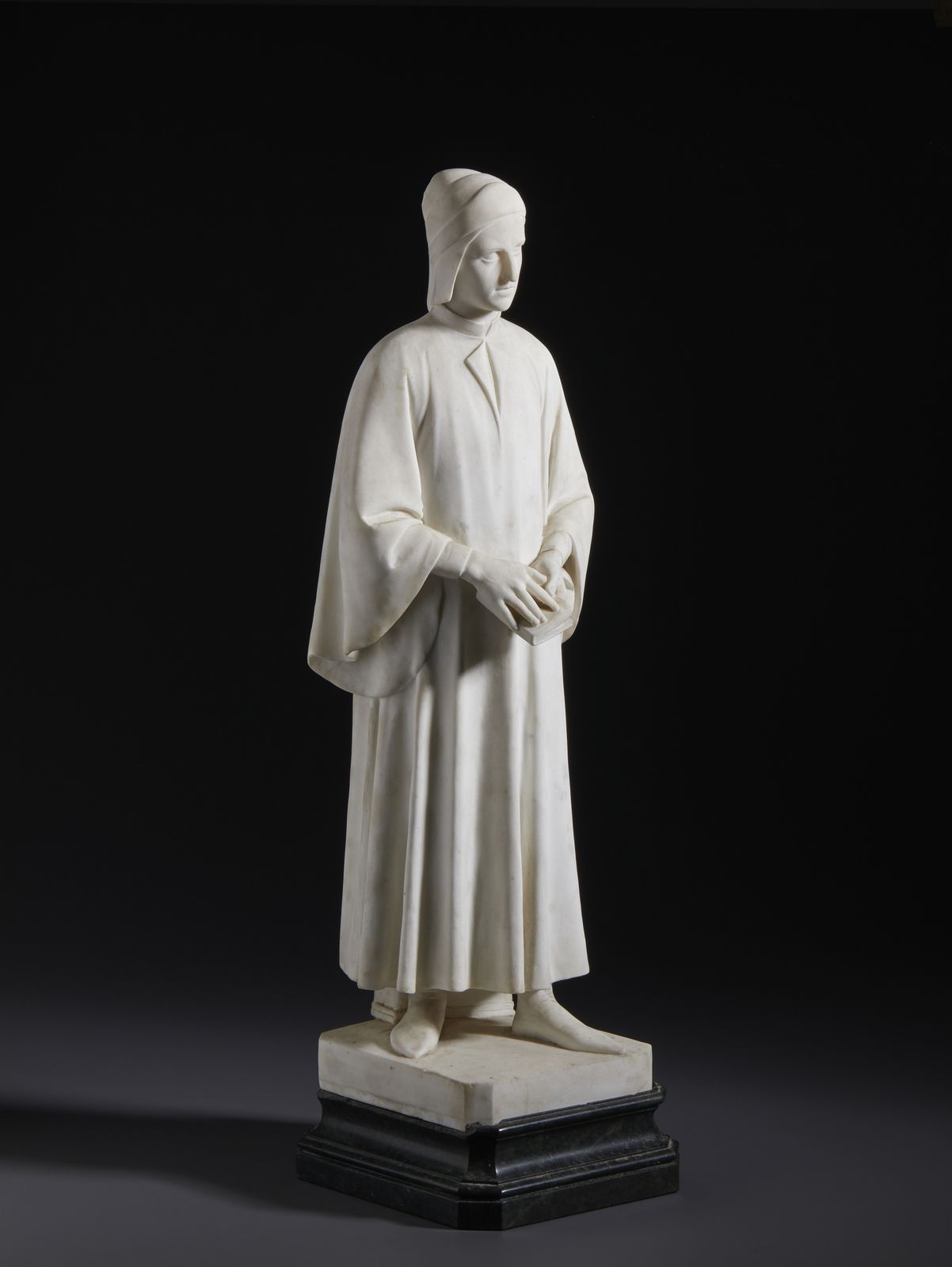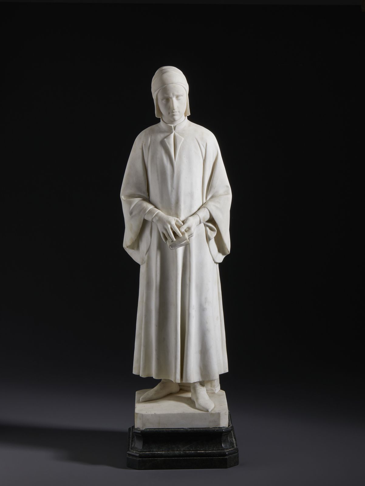 Firmato alla base. Dimensioni con base in marmo verde (difetti): 76,5x21,5x24,5 cm.Provenienza:Studio di Giovanni Dupré.Per eredità all'attuale proprietà, SienaLa presente scultura si colloca nel clima di generale fermento e rinnovato interesse verso la figura di Dante a cui si assistette nel corso XIX secolo a Firenze, a partire dall'esecuzione del cenotafio del poeta in Santa Croce ad opera di Stefano Ricci (inaugurato nel 1830). Giovanni Dupré riprodusse la figura di Dante in più varianti a partire dal 1843, sia a busto che a figura intera, spesso accompagnata in coppia da quella di Beatrice. Il Dantino a figura intera, come quello qui proposto, fu il modello che ebbe maggiore successo, venendo eseguito in più esemplari rispetto al Dante in 2/3. Una coppia composta da Dante e Beatrice a figura intera, di dimensioni simili alla nostra scultura, è conservata presso la Collezione Chigi-Saracini di Siena.