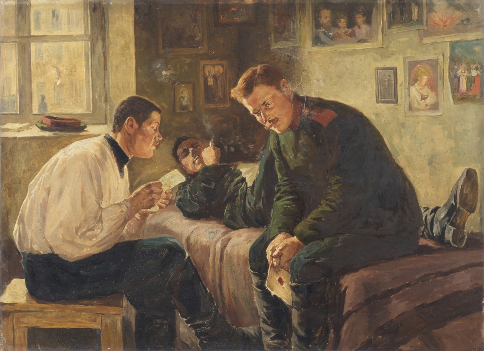 Firmato in basso a sinistra. Al retro cartiglio A La Vieille Russie. Si ringrazia la Dottoressa Rimgaila Salys per aver confermato l'attribuzione dell'opere su base fotografica.L’opera verrà inserita nel prossimo catalogo ragionato dell’artista redatto da Olga Sugrobova-Roth.Provenienza: già Madame de Sobinoff (come da cartiglio al retro).Collezione privata.Bibliografia di riferimento:Rimgaila Salys, Leonid Pasternak: the Russian years, 1875-1921, Vol. I, Oxford Univ Pr, 1999, n. 21-22.L'opera qui proposta è uno studio, databile al 1889, per l'omonimo dipinto conservato alla Galleria Tretyakov di Mosca. Il dipinto rievoca il tempo in cui Pasternak si arruolò come volontario nell'esercito tra il 1885 e il 1886. In questo periodo l’artista si dedicò assiduamente al disegno, cercando di riprendere tutto ciò che vedeva e lo colpiva: risalgono infatti a questi anni i primi schizzi per 'Lettera da casa', poi eseguito nel 1889, una volta trasferitosi a Mosca. Durante la sua permanenza nella capitale Pasternak entrò in contatto con alcuni importanti circoli culturali, frequentando pittori, aristocratici e cantanti, tra cui la galleria A la Vieille Russie, di cui si può vedere al retro della tela l’etichetta. Divenne inoltre amico del tenore Sobinov alla cui moglie appartenne quest’opera. Il dipinto finito oggi alla Galleria Tretyakov viene considerata la prima opera di rilievo dell'artista. dalle informazioni fornite dal Pasternak Trust, che ringraziamo, si evince che la versione oggi a Mosca venne acquistata da Tretyakov direttamente da Pasternak per entrare nella sua collezione e partecipò alla mostra annuale del gruppo Peredvizhniki, che corrispose al primo successo del pittore. La prima versione di una ‘Lettera da casa’ venne invece donata (o venduta?) dallo stesso artista al cugino Karl Pasternak. Il dipinto qui proposto può essere considerato uno studio di poco precedente a quello conservato al museo russo in quanto vari elementi, come il colore dei capelli e i lineamenti della figura principale che ascolta, sono più simili a questo che alla prima versione.