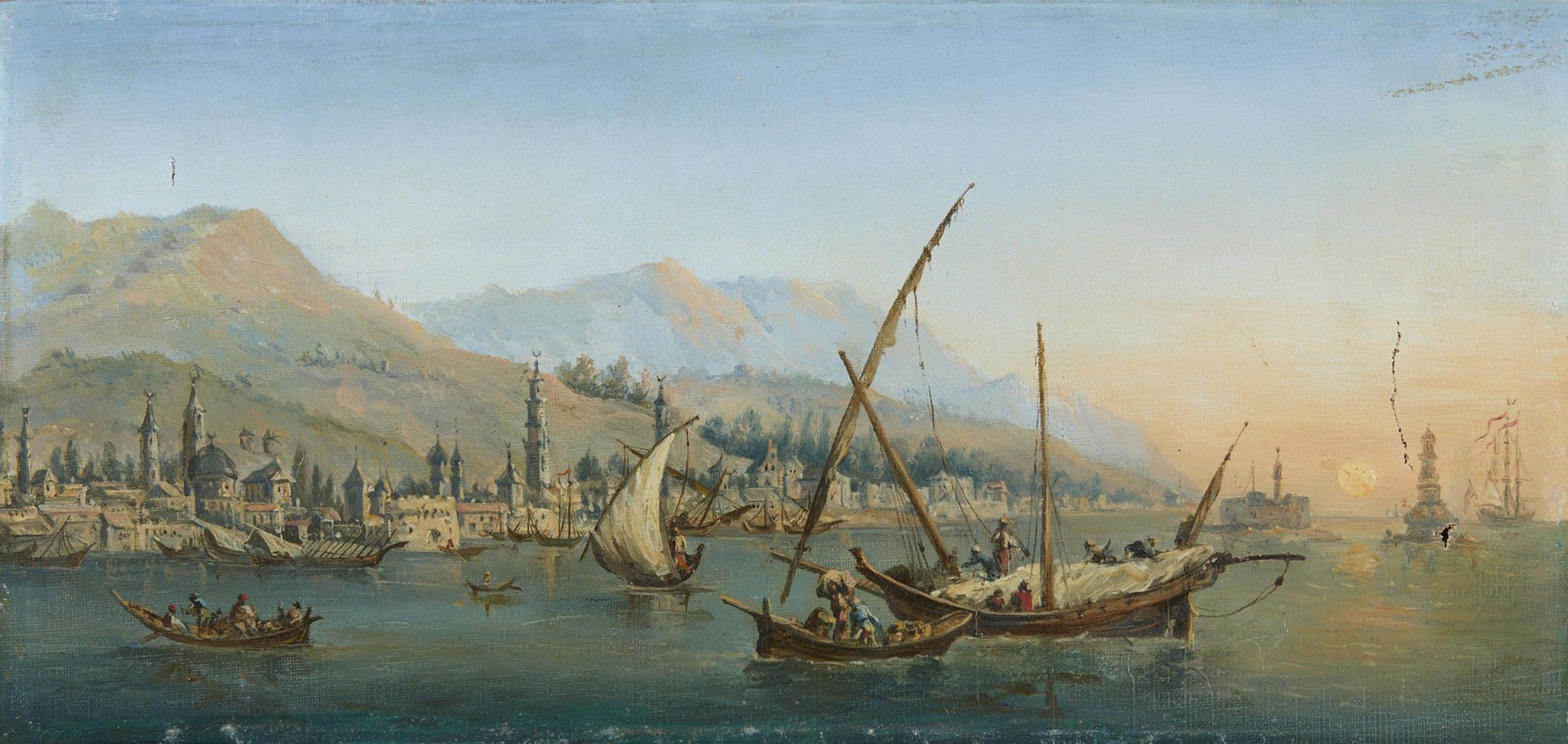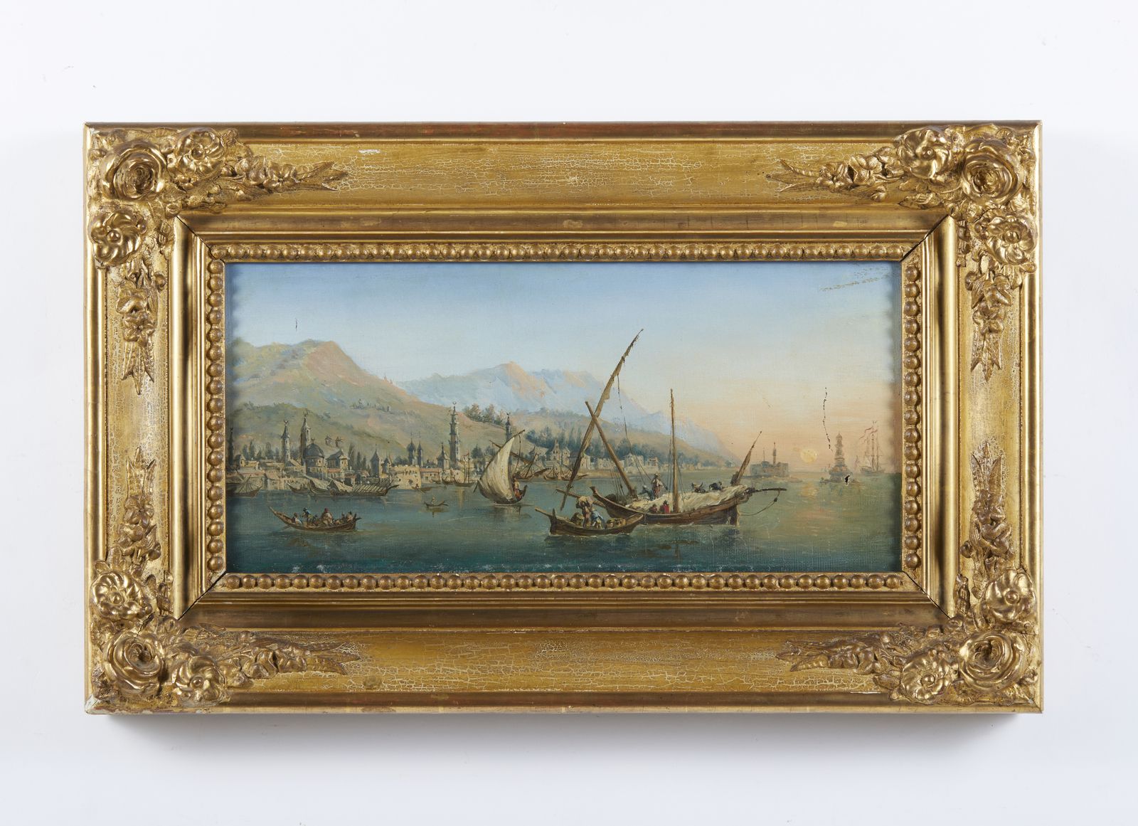 Veduta di porto orientale con feluche e altre imbarcazioni