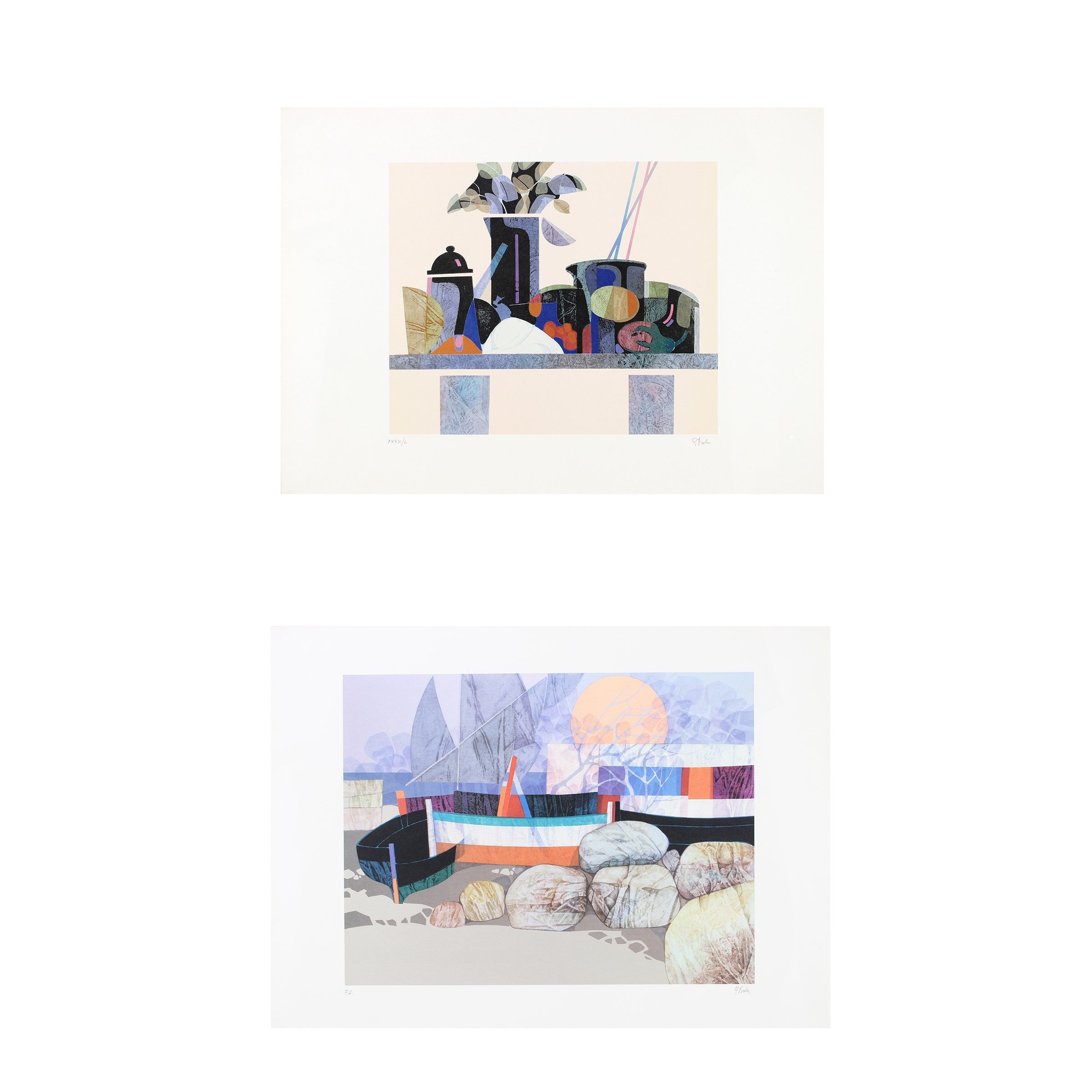 Livorno 1927 - Roma 2018 'Natura morta - Barche', coppia di litografie a colori, es. XXXIII/L - P.A. firmate in basso a destra, entro cornici