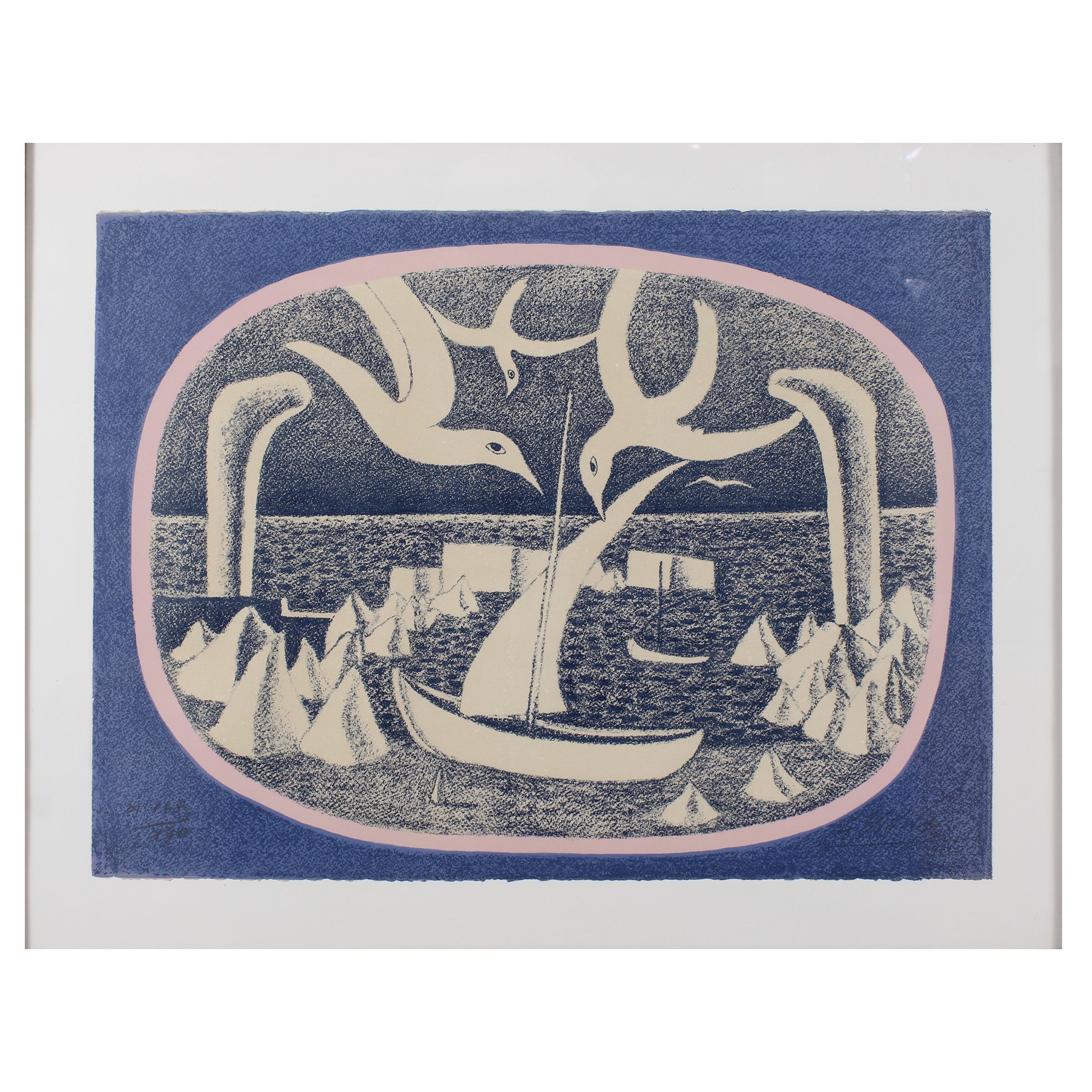 San Giuliano Terme 1898 - Pisa 1965 'Gabbiani con barche a vela', 1963, litografia a colori es. 178/180, firmata e datata in basso a destra, entro cornice