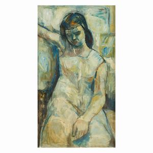 60x50 cm. Napoli 1925 - Roma 2000 'Diva', olio su tela, firmato in basso a destra, firmato e titolato sul retro, [..]