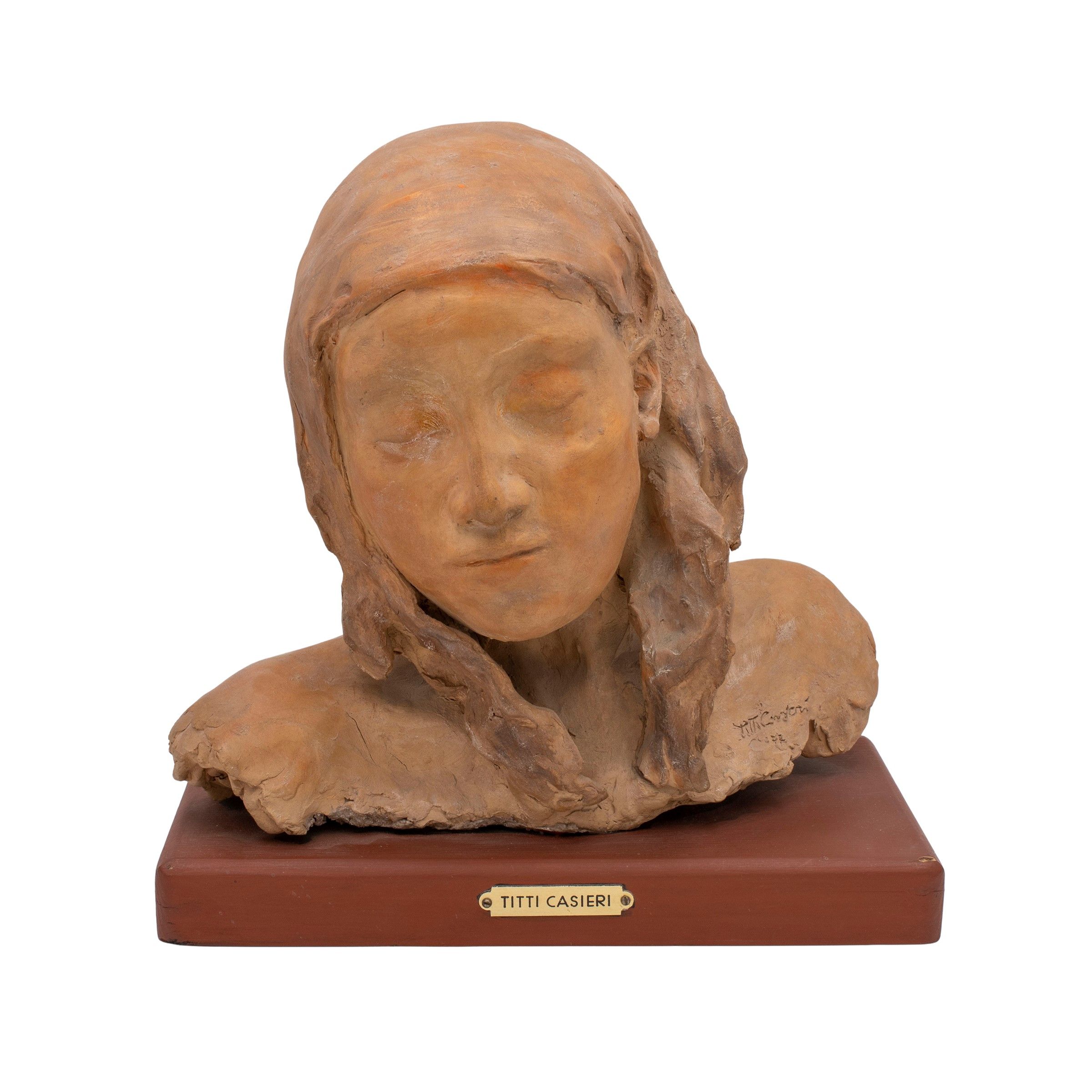 Italia, XX Sec. 'Testa di ragazza', 1977, scultura in terracotta, firmata e datata in basso a destra, poggiante su base rettangolare in legno