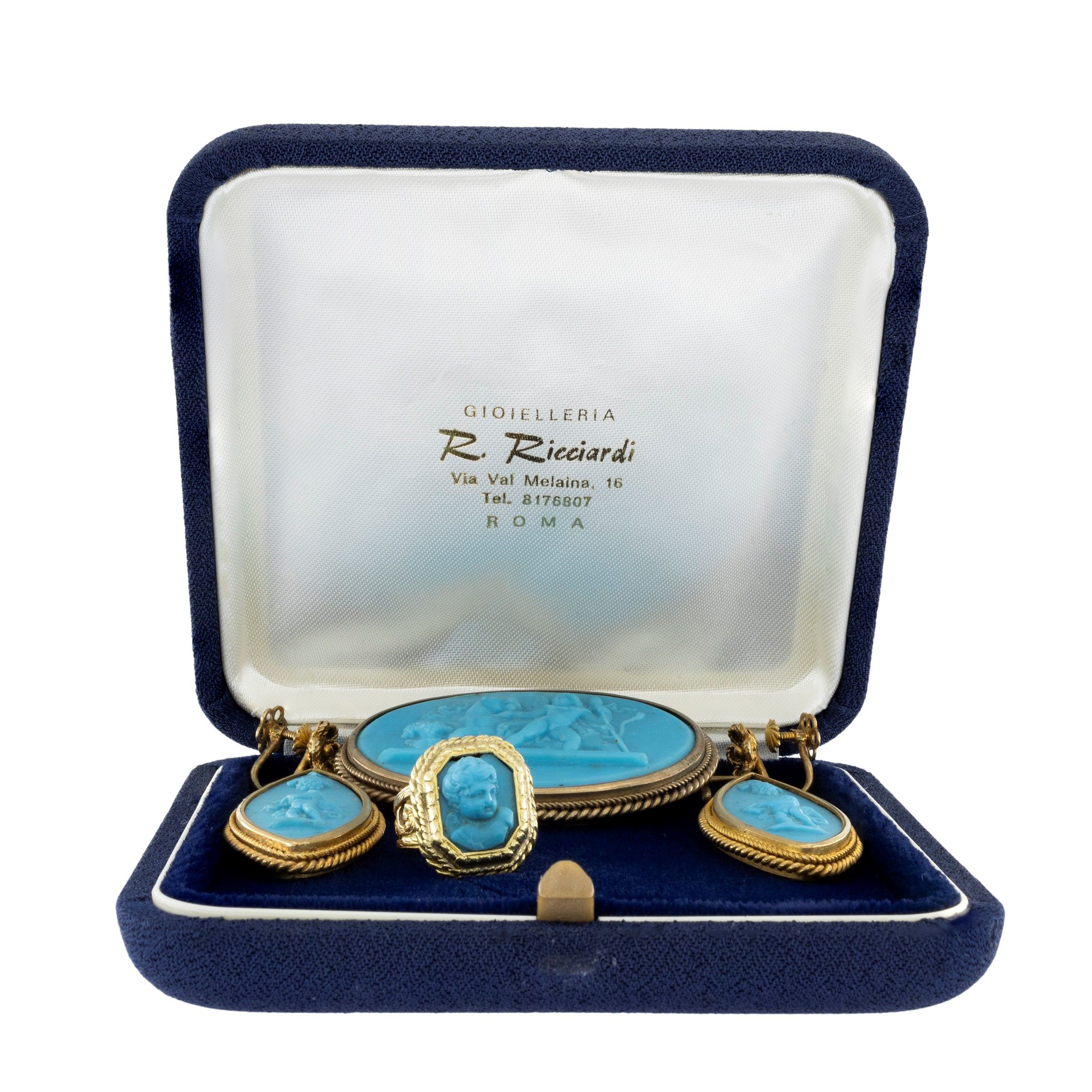 primi '900 scolpita a raffigurare scene mitologiche, composta da una spilla dimensioni 5x3,8 cm. - orecchini pendenti lunghezza 6 cm. - anello misura 4