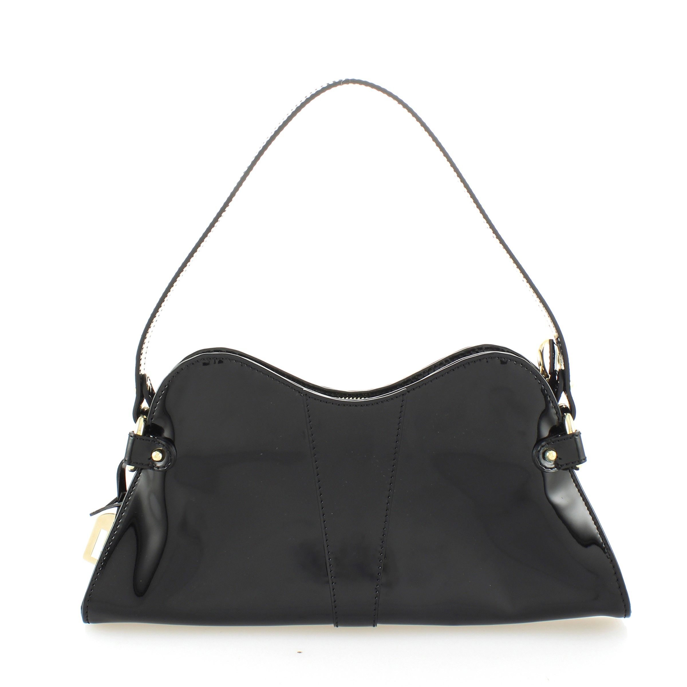 in vernice nera, finiture dorate, interno in tessuto ad uno scomparto con tasca, chiusura a cerniera, completa di carta di autenticità e dust bag, ottime condizioni