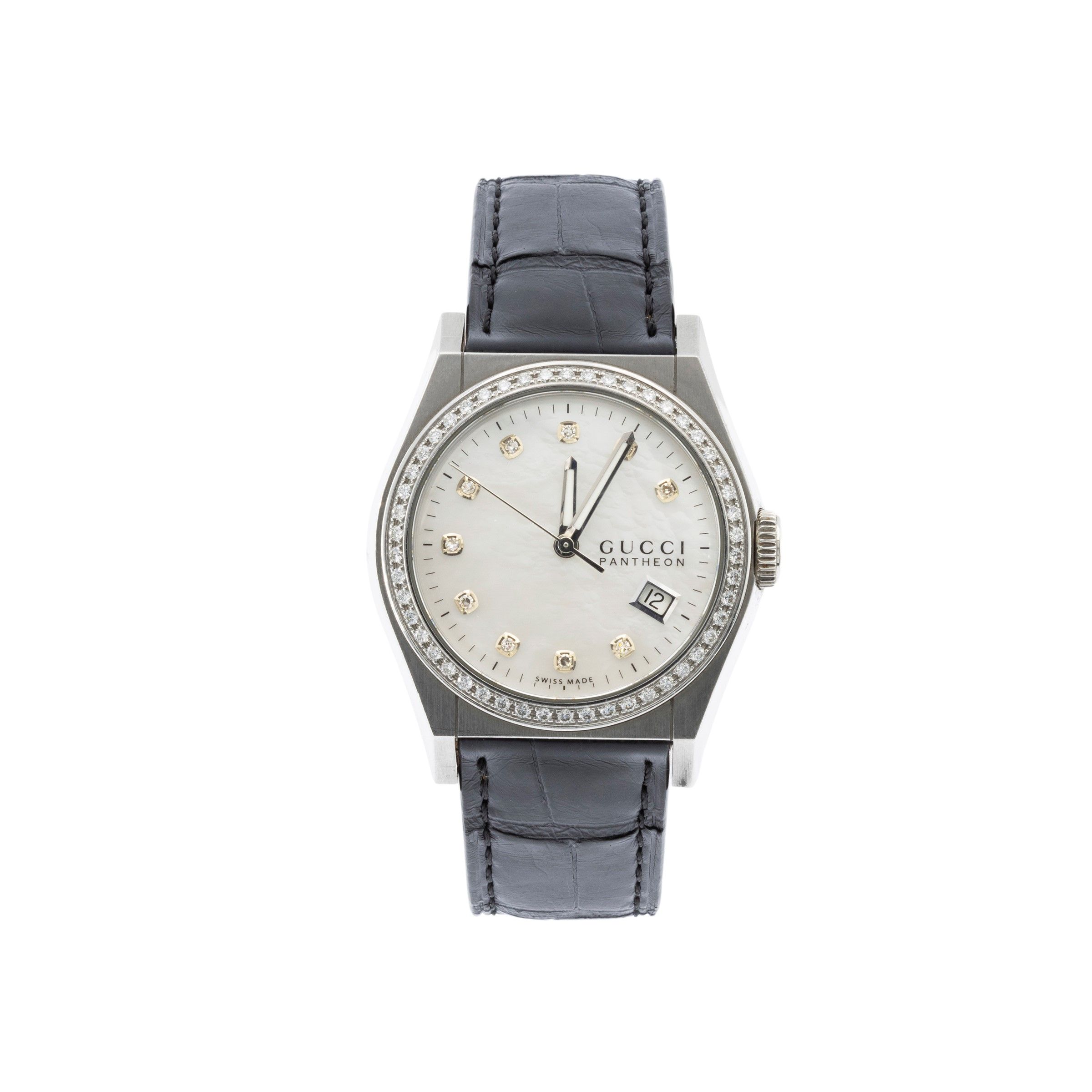 in acciaio e diamanti taglio brillante ct 1,20 circa, ref. 123.5, cassa 36 mm. quadrante in madreperla indici con diamanti, datario tra le ore 3 e 4, movimento al quarzo, cinturino originale con chiusura deployante