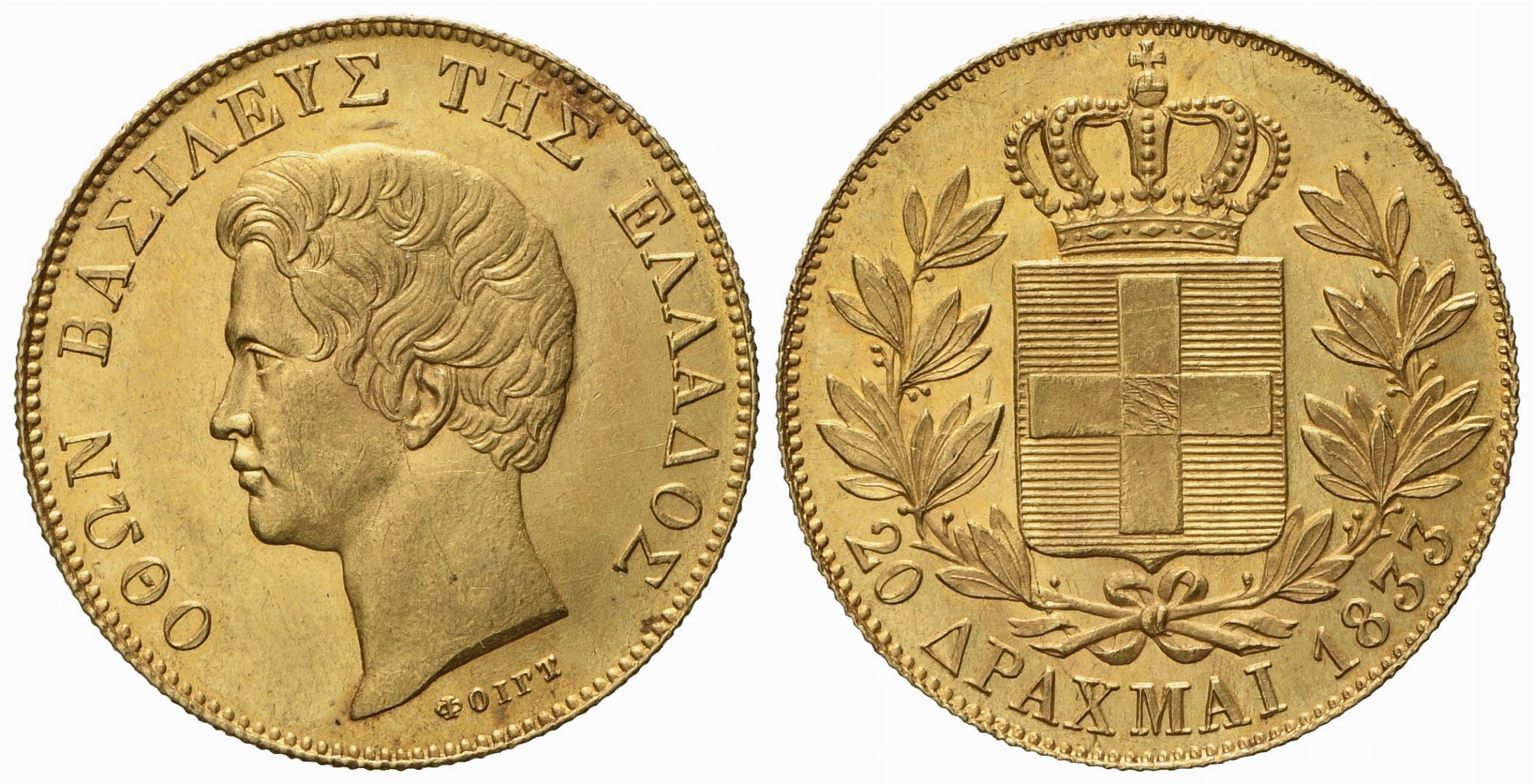 GRECIA. Ottone I (1831 - 1863). 20 dracme 1833. Au (5,76 g; 20,6 mm)
