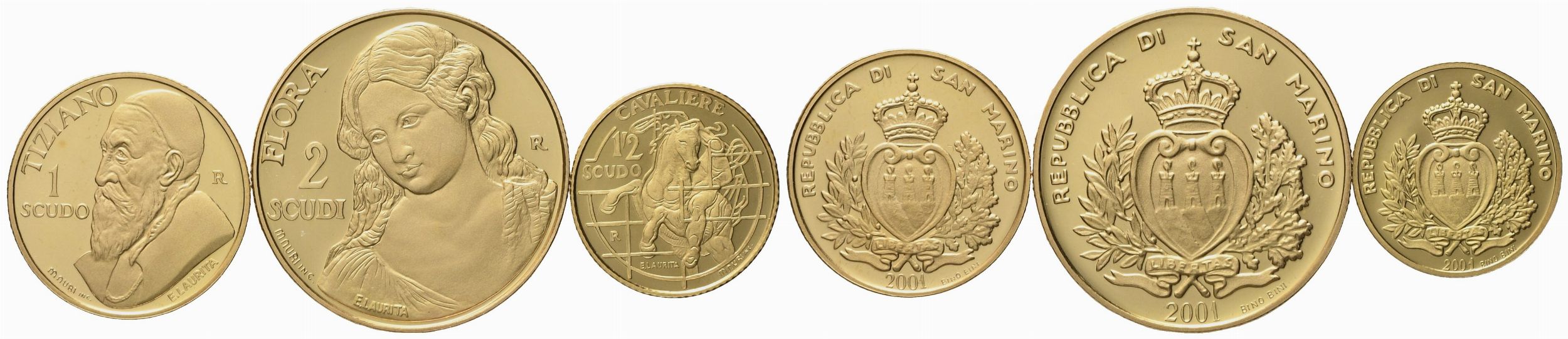 SAN MARINO. 2, 1 e mezzo scudo 2001, trittico. Au 900 (11,28 g)