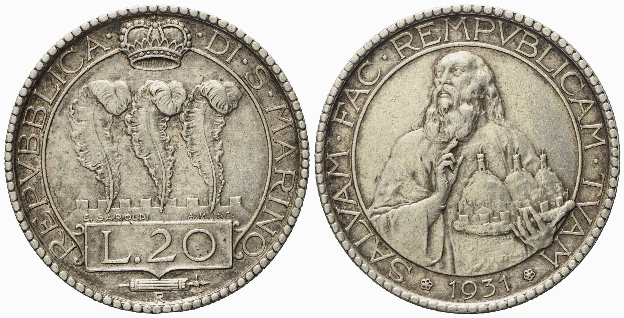 SAN MARINO. Vecchia monetazione (1864 - 1938). 20 Lire 1931. Ag (14,98 g; 35,5 m [..]