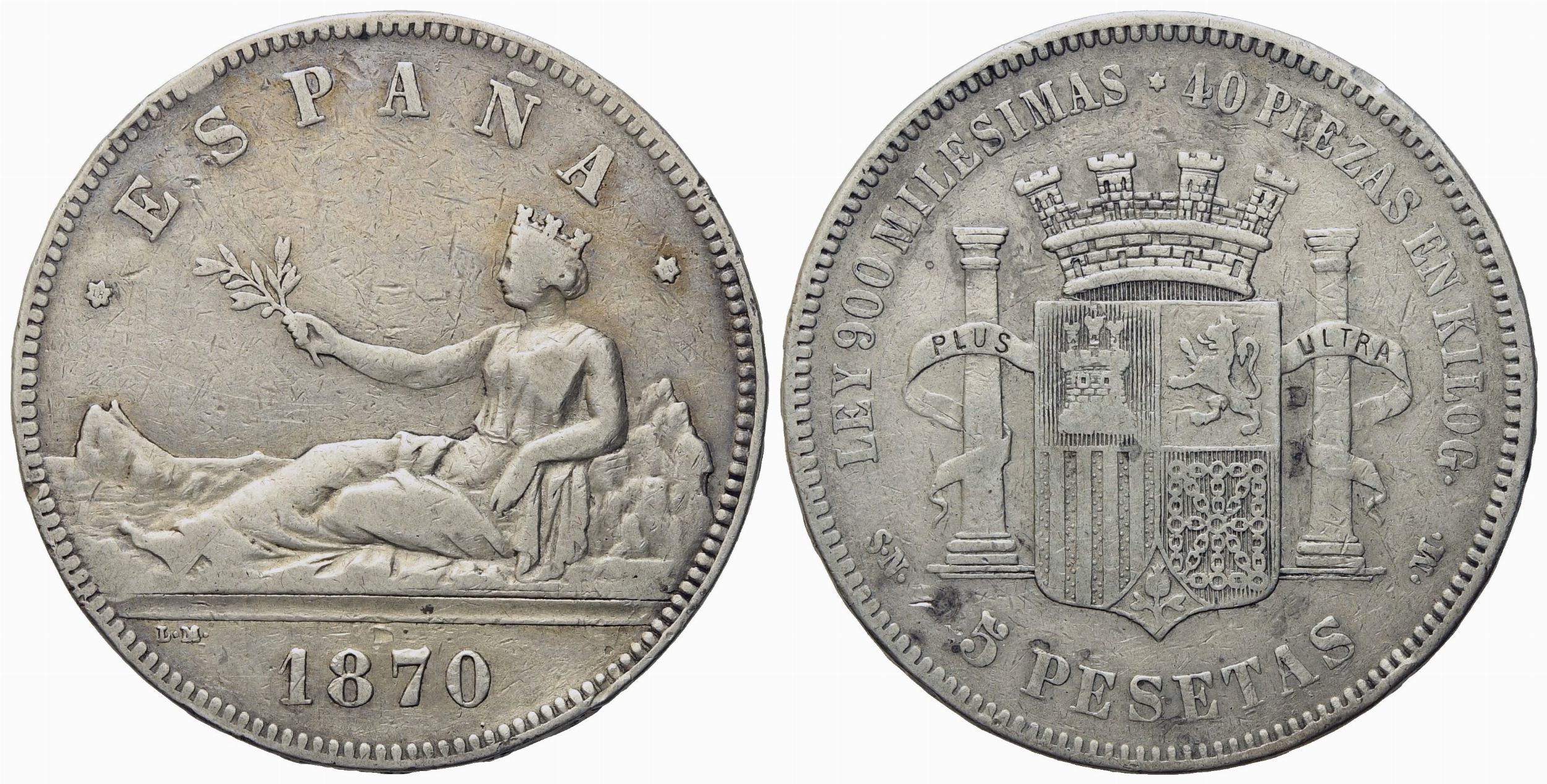 SPAGNA. Governo provvisorio. 5 pesetas 1870. Ag (24,62 g; 37 mm)