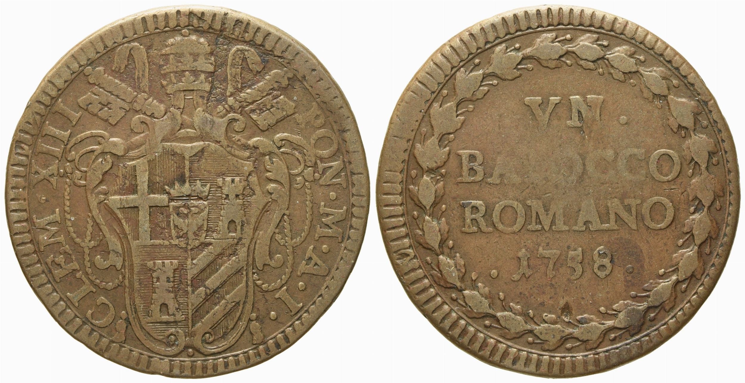 STATO PONTIFICIO. Roma. Clemente XIII (1758 - 1769). Baiocco 1758. Cu (g 10,45; [..]