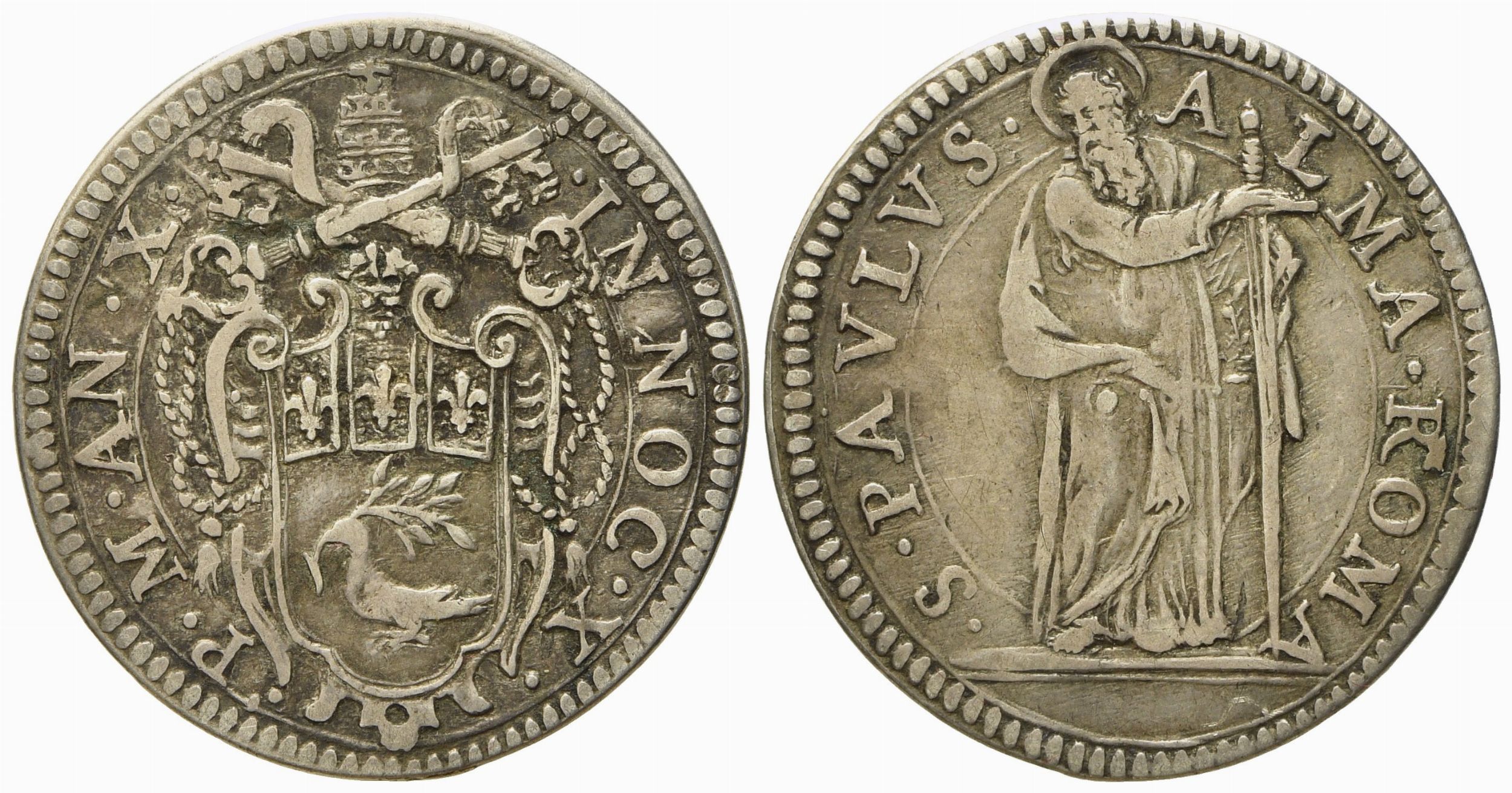 STATO PONTIFICIO. Roma. Innocenzo X (1644 - 1655). Giulio anno X San Paolo. Ag (g [..]