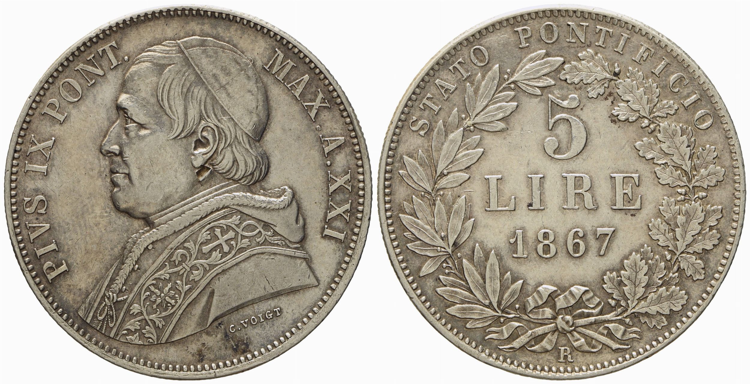 STATO PONTIFICIO. Roma. Pio IX (1846 - 1870). 5 Lire 1867. Ag (g 25,03; mm 37,3) [..]