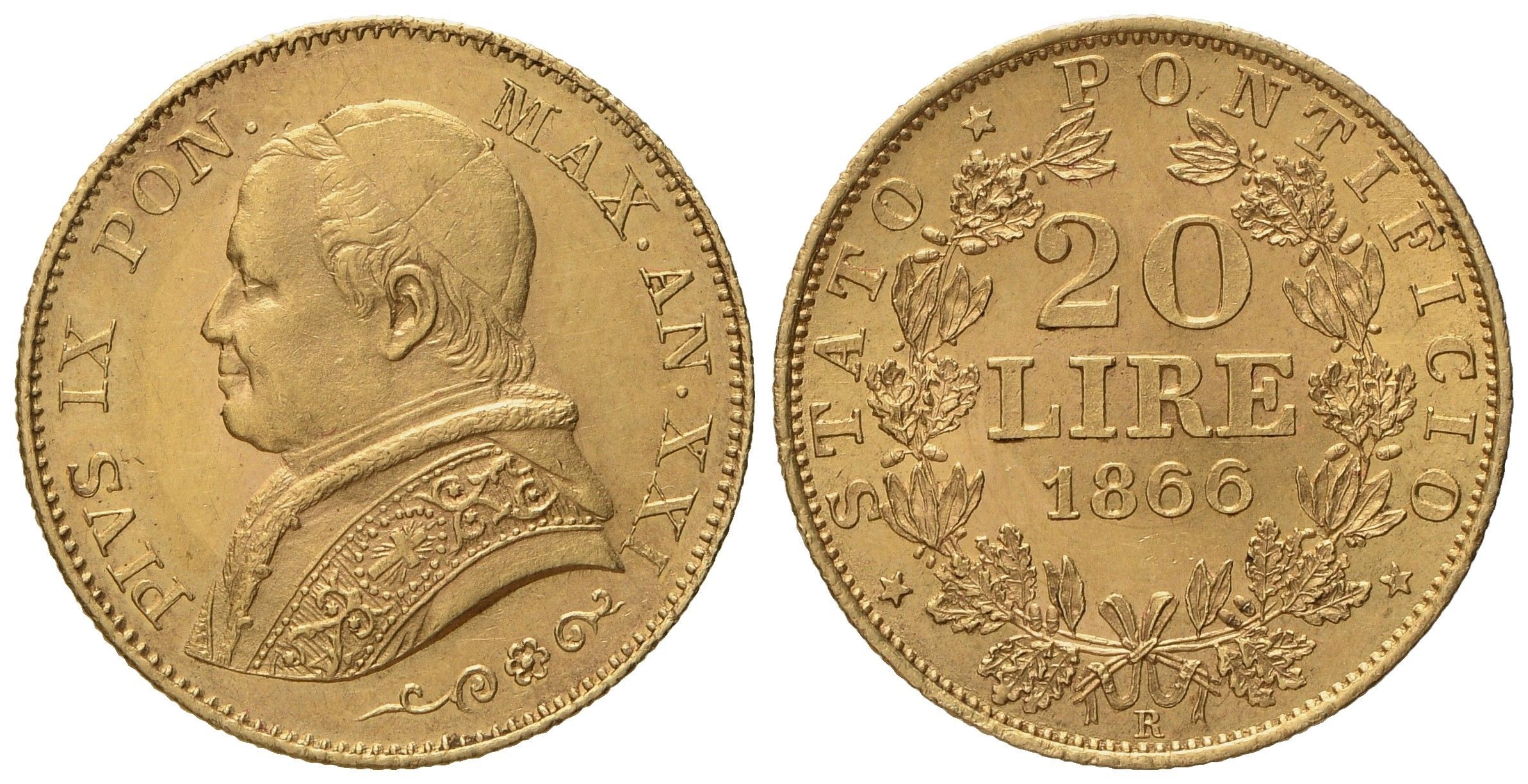 STATO PONTIFICIO. Roma. Pio IX (1846-1870). 20 Lire 1866. Au (6,44 g; 21,2 mm)
