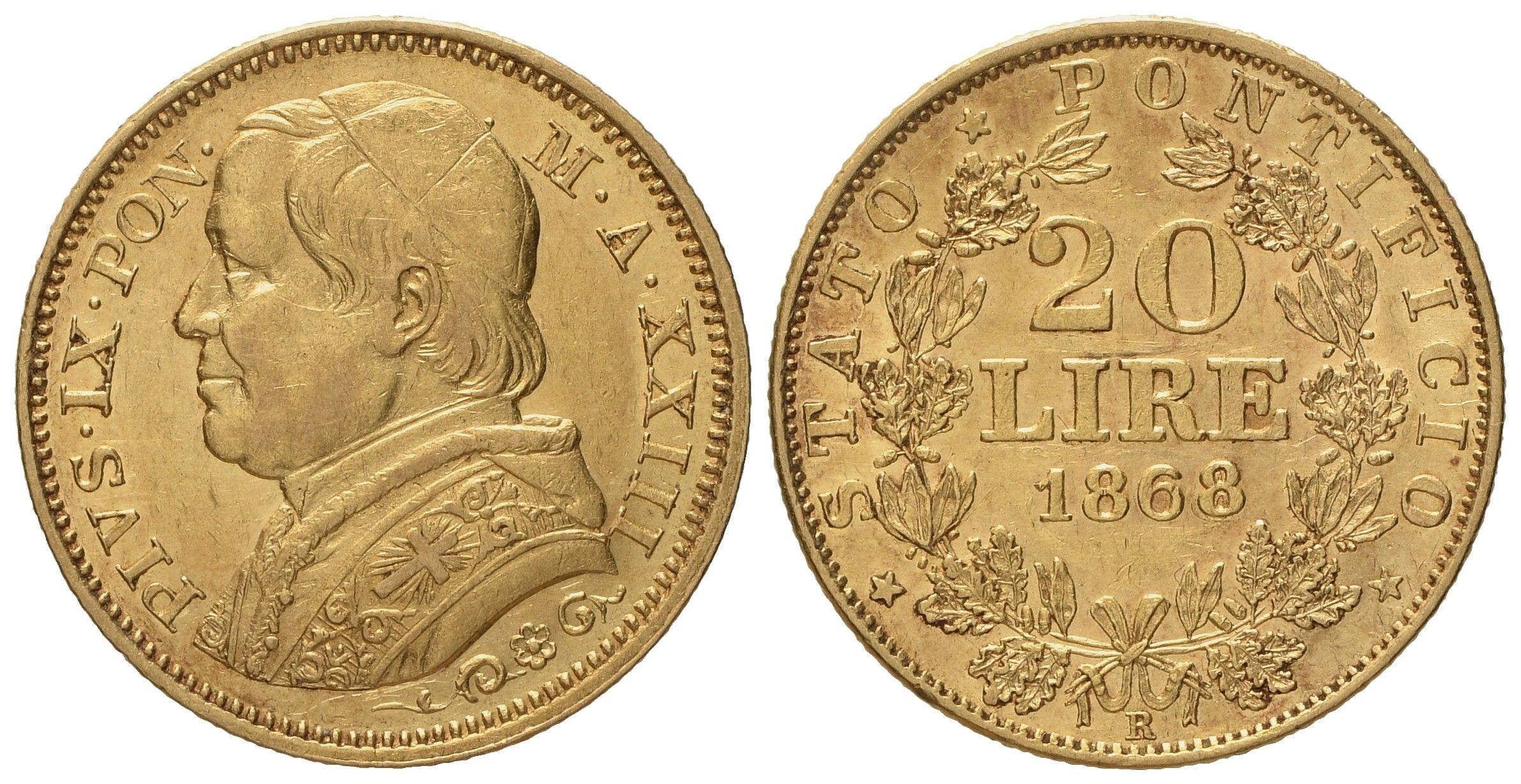 STATO PONTIFICIO. Roma. Pio IX (1846-1870). 20 lire 1868 XXIII. Au (6,42 g; 21,3 [..]