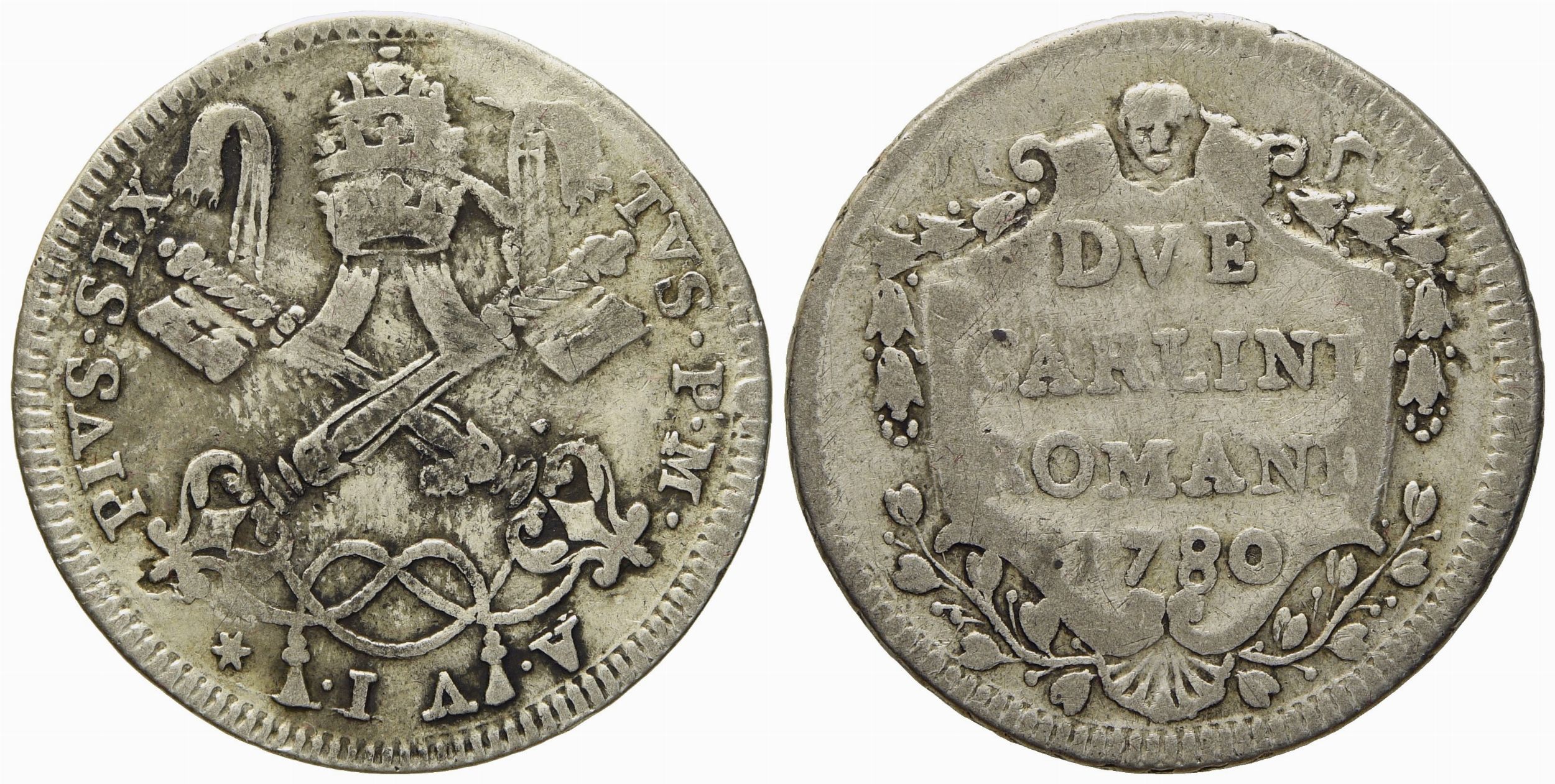 STATO PONTIFICIO. Roma. Pio VI (1775 - 1799). 2 carlini romani 1780, anno VI. Mi [..]