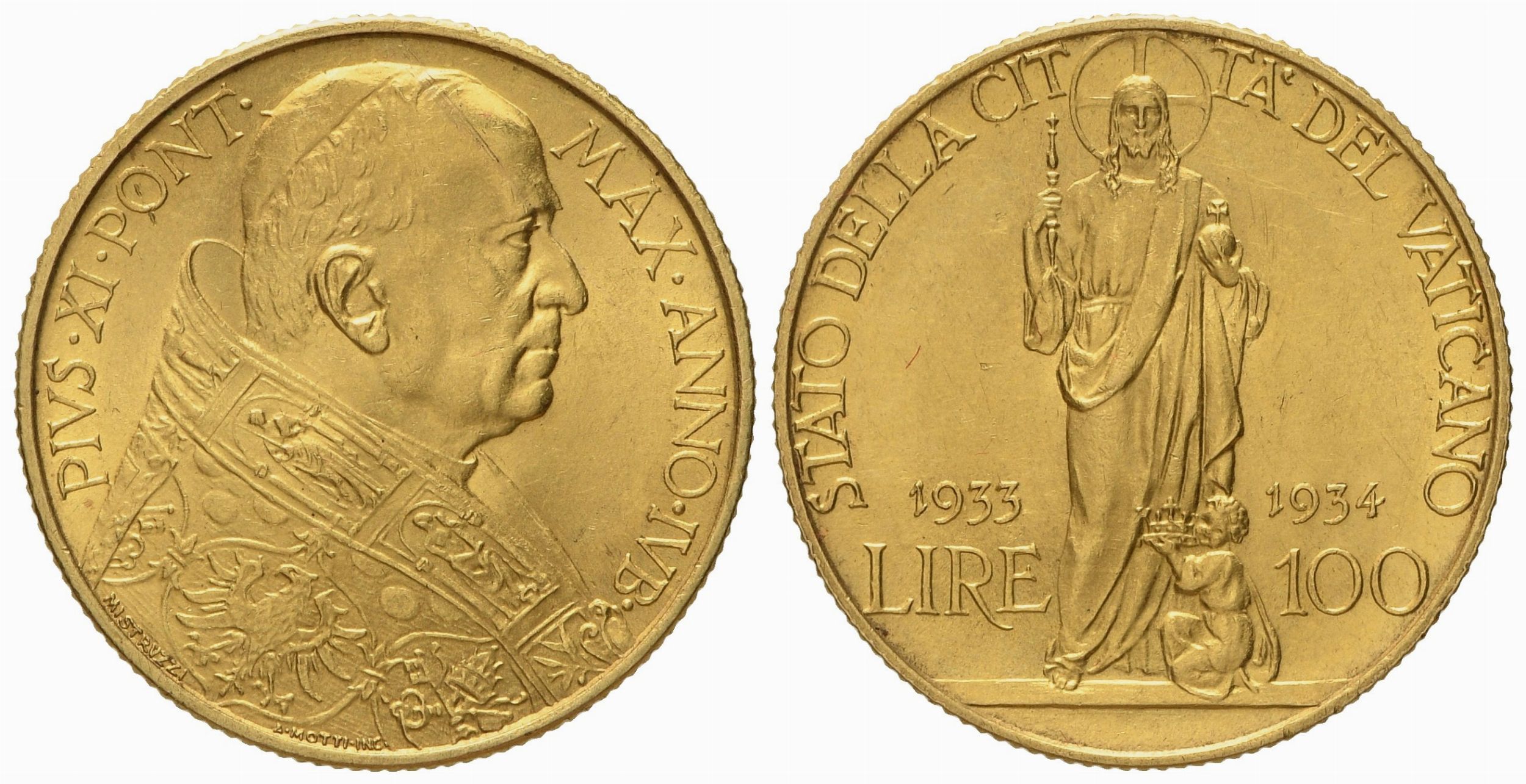 VATICANO. Pio XI (1929-1938). 100 lire 1933 1934 Giubileo. Au (8,78 g; 23,4 mm)