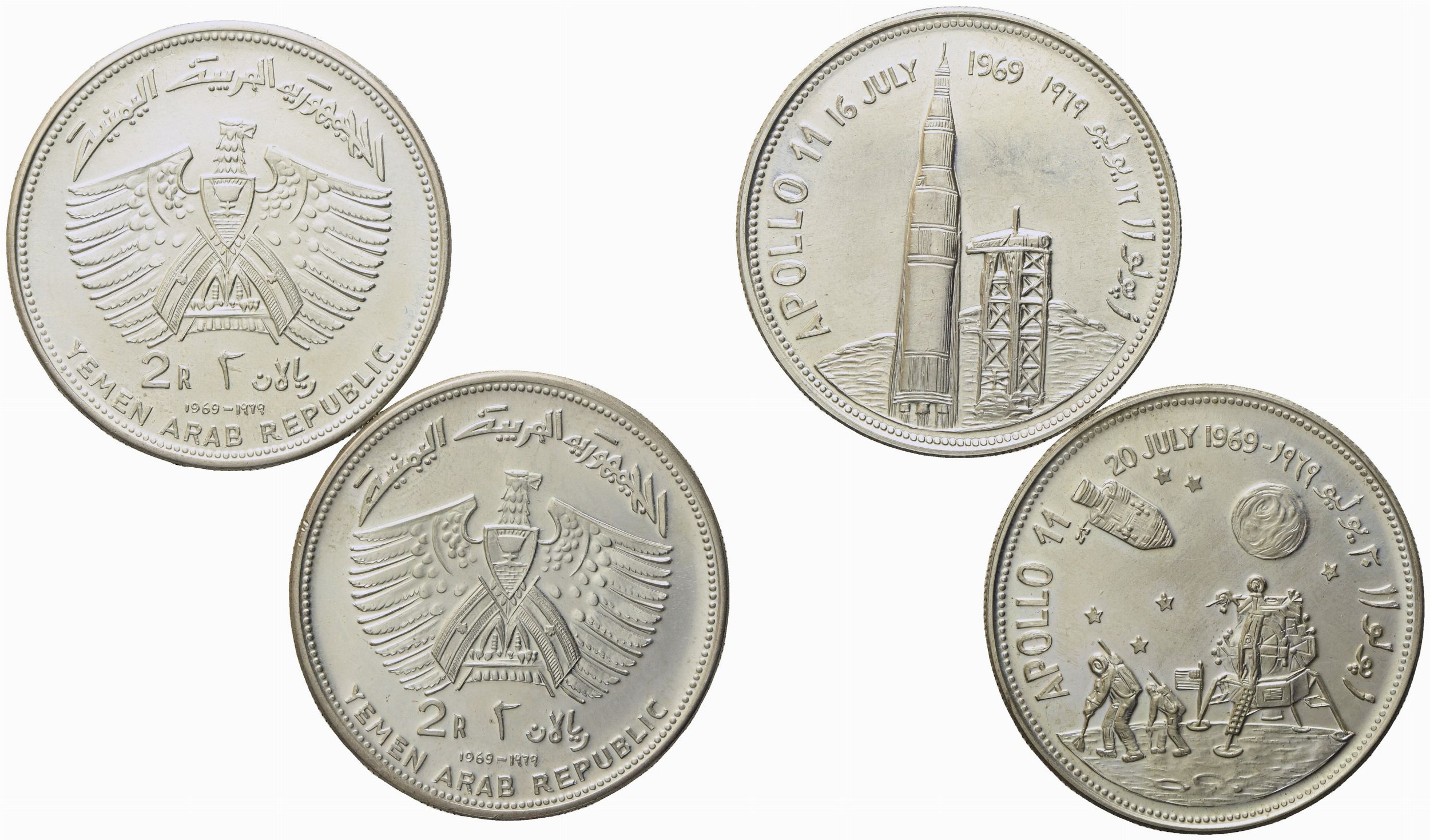 YEMEN. 2 Rials Apollo 11 1969. Lotto di due esemplari. Ag (25,05 g; 37 mm cad.)