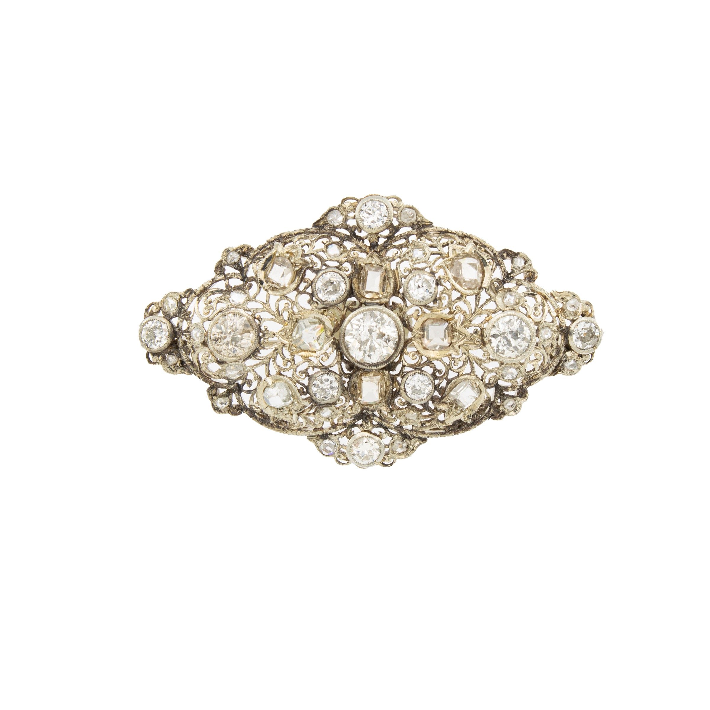 primi '900 un diamante taglio brillante antico ct 1,20 circa, due diamanti ct 0,80, altri diamanti ct 1,20 circa e rose coroné, dimensioni 5x3 cm.