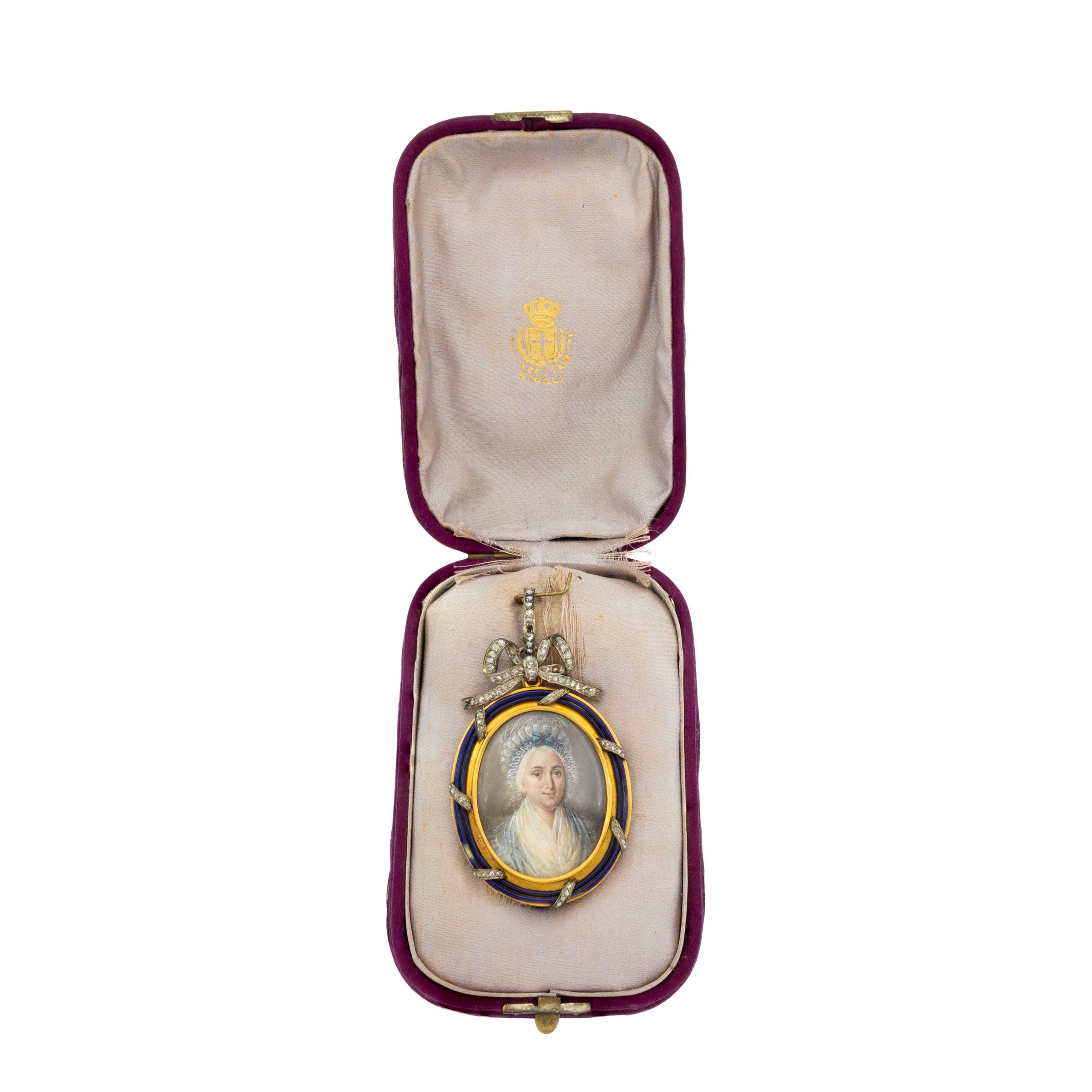 peso 38 gr. fine XVIII Sec. raffigurante da un lato nobildonna e dall'altro nobiluomo dipinti in policromia, entro cornice in oro argento smalto blu, lievi difetti e rose di diamante, una mancante, dimensioni 7,5x4,5 cm. completo di scatola coeva
