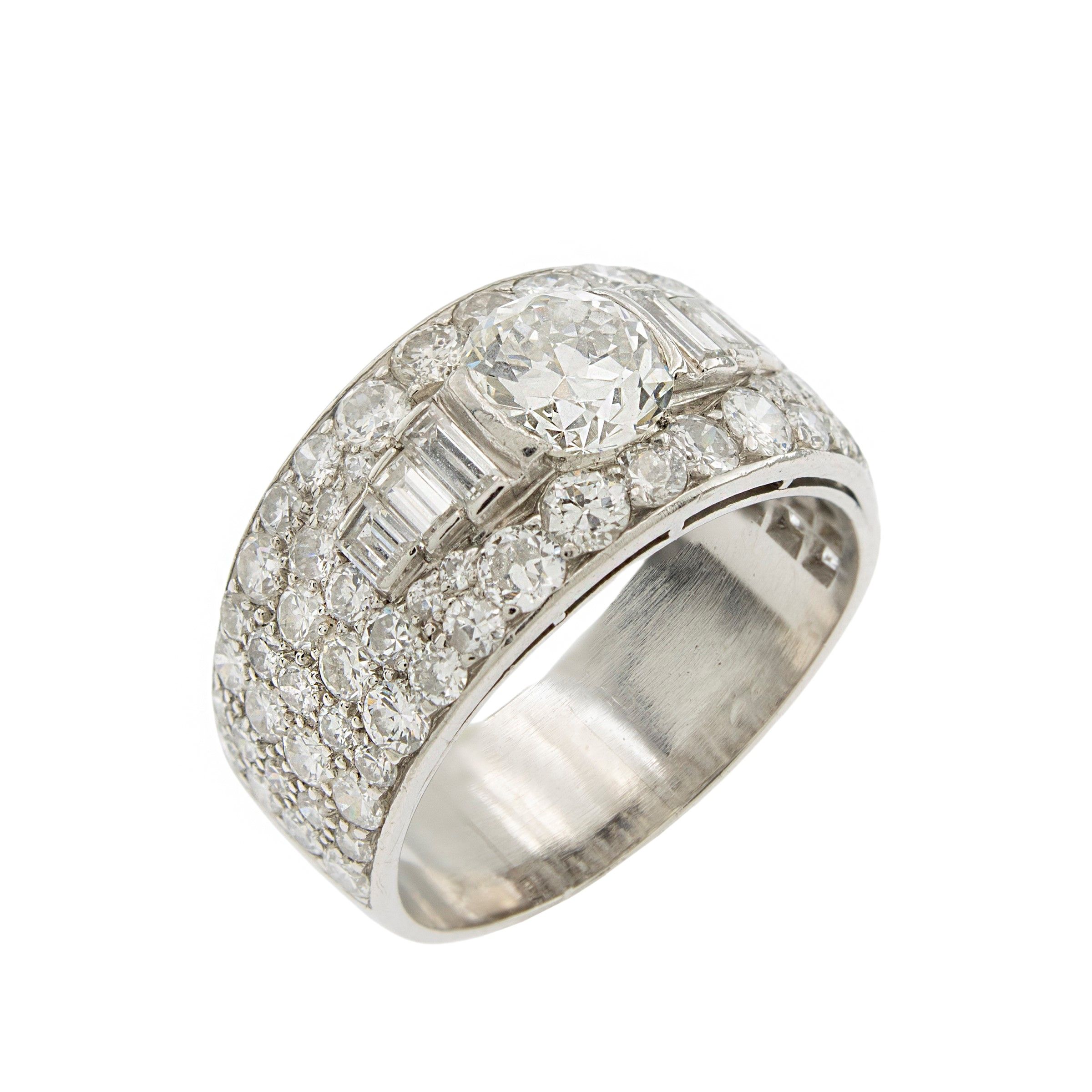 firmato, anni 80 circa taglio brillante antico ct 0,90 circa e diamanti taglio brillante e baguettes ct 2 circa, misura 19