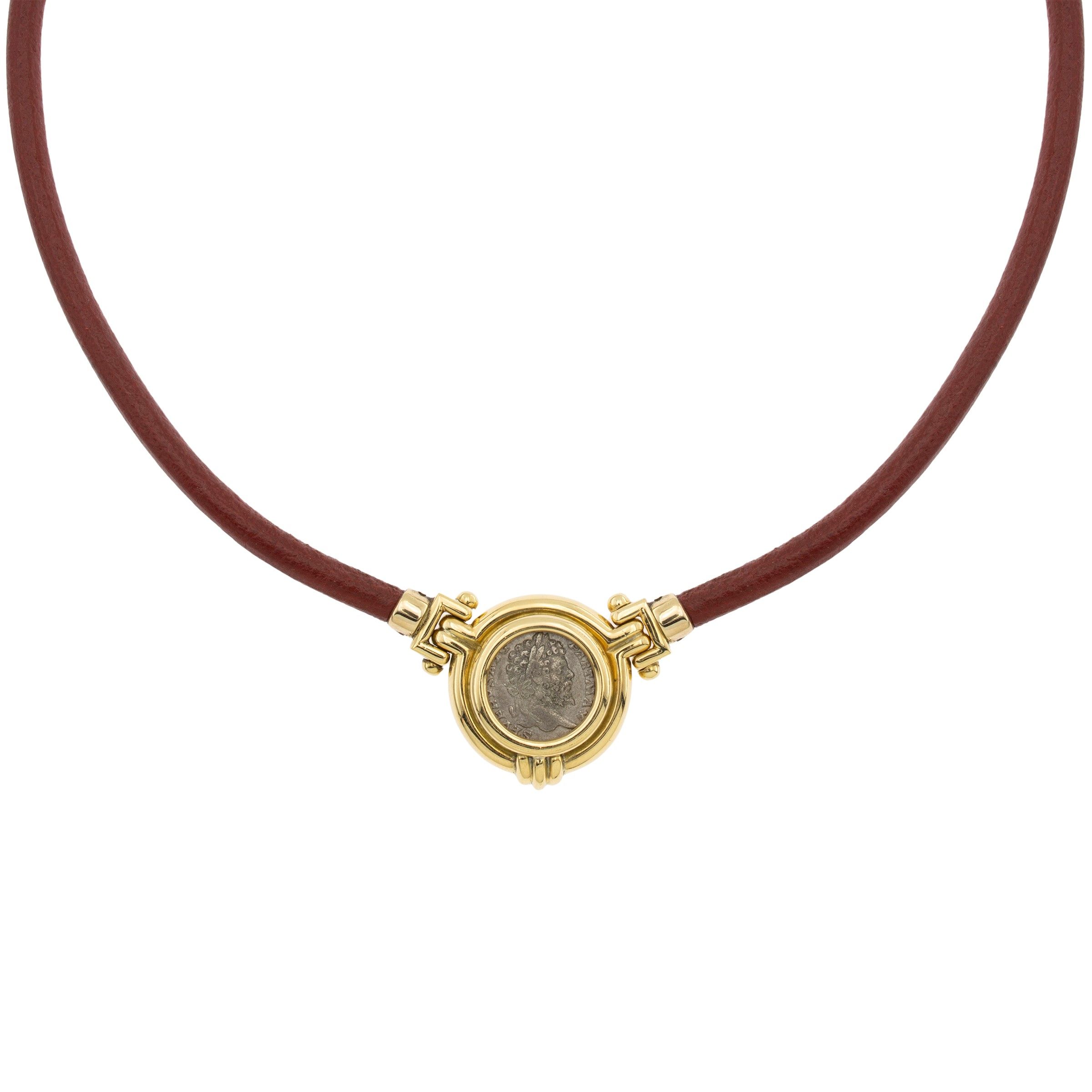 firmata, anni 80/90 in oro giallo 18kt con moneta romana in argento, laccio in cuoio rosso, lunghezza 46 cm.