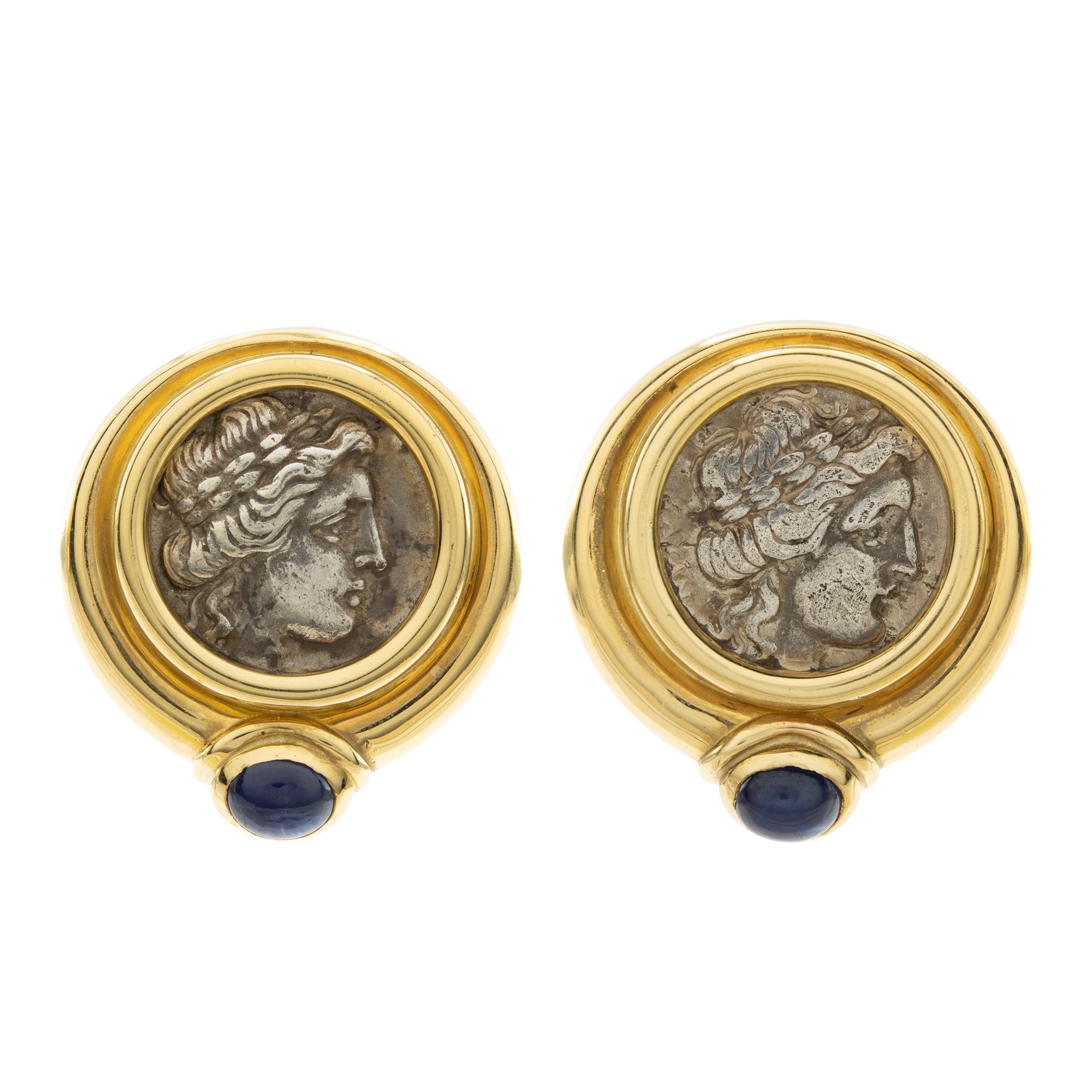firmati, anni 90 circa in oro giallo 18kt con monete in argento e due zaffiri taglio cabochon, dimensioni 2,9x2,6 cm.