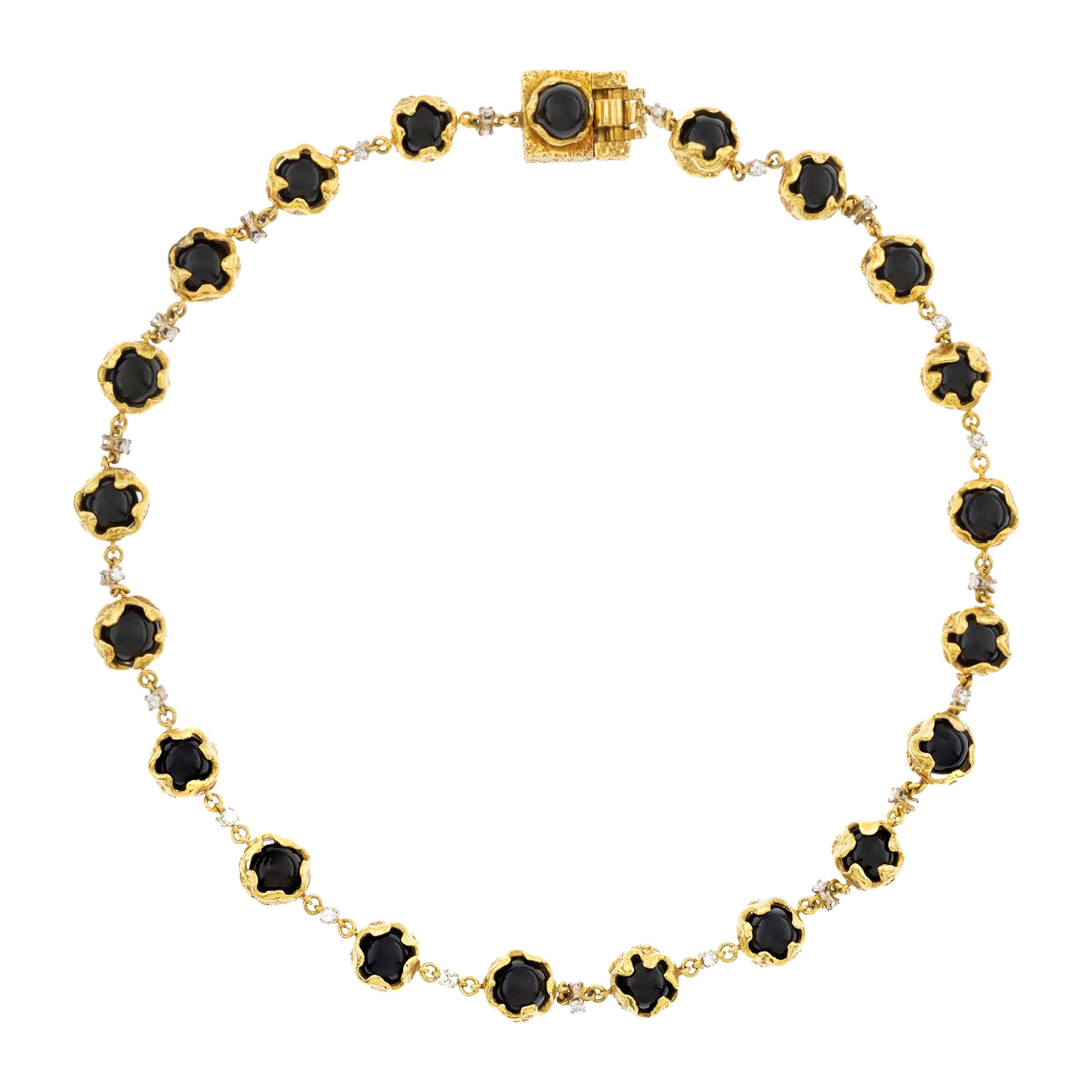 firmata, anni 70 circa sfere in onice nero alternate da diamanti taglio brillante ct 0,90 circa, lunghezza 42 cm.