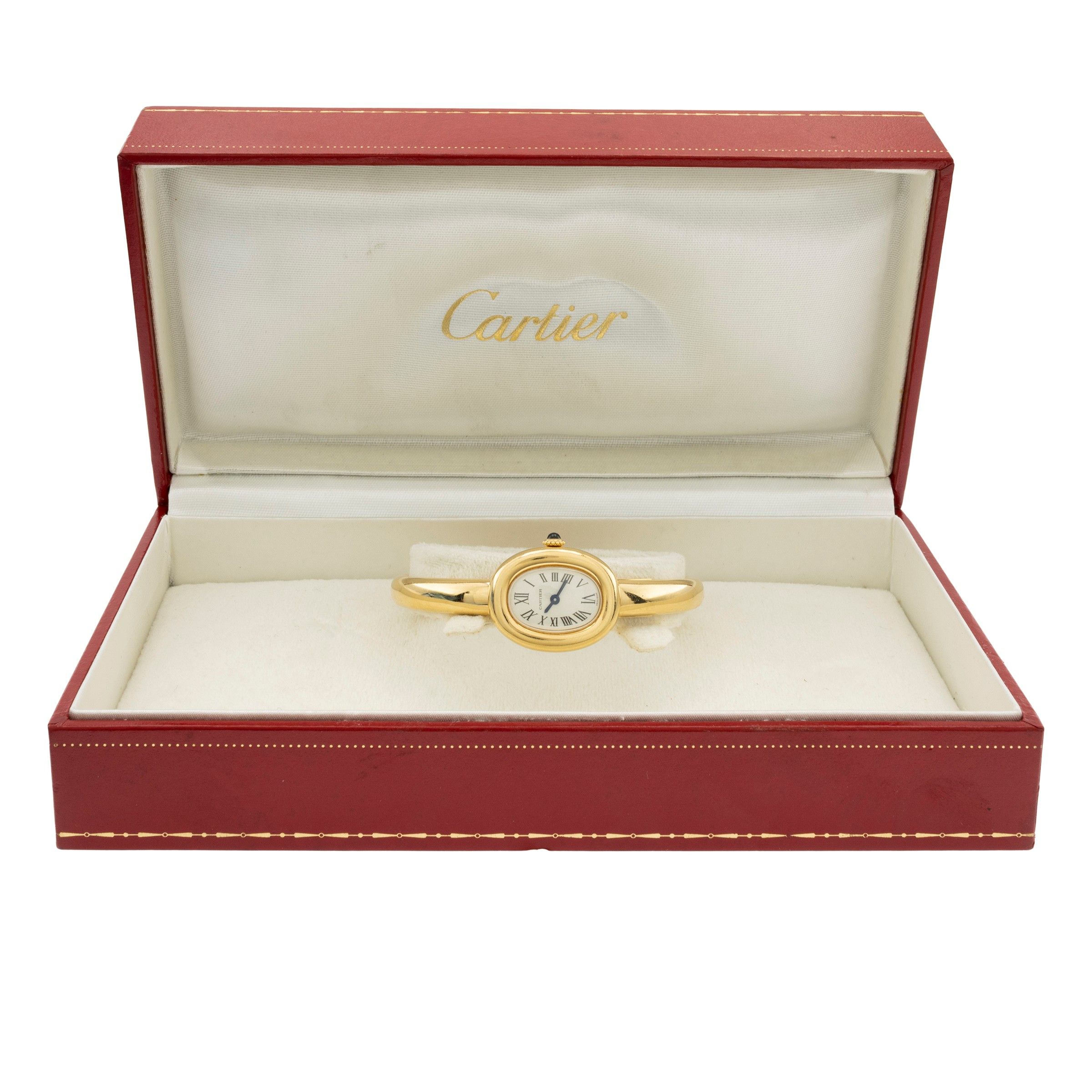 firmato e numerato in oro giallo 18kt, modello mini, ref. 4514 -136931 DY, cassa ovale 24,6x18,7 mm. quadrante bianco con numeri romani, corona con zaffiro cabochon, vetro zaffiro, movimento al quarzo, calibro 159, bracciale rigido in oro giallo 18kt, misura 16, completo di scatola