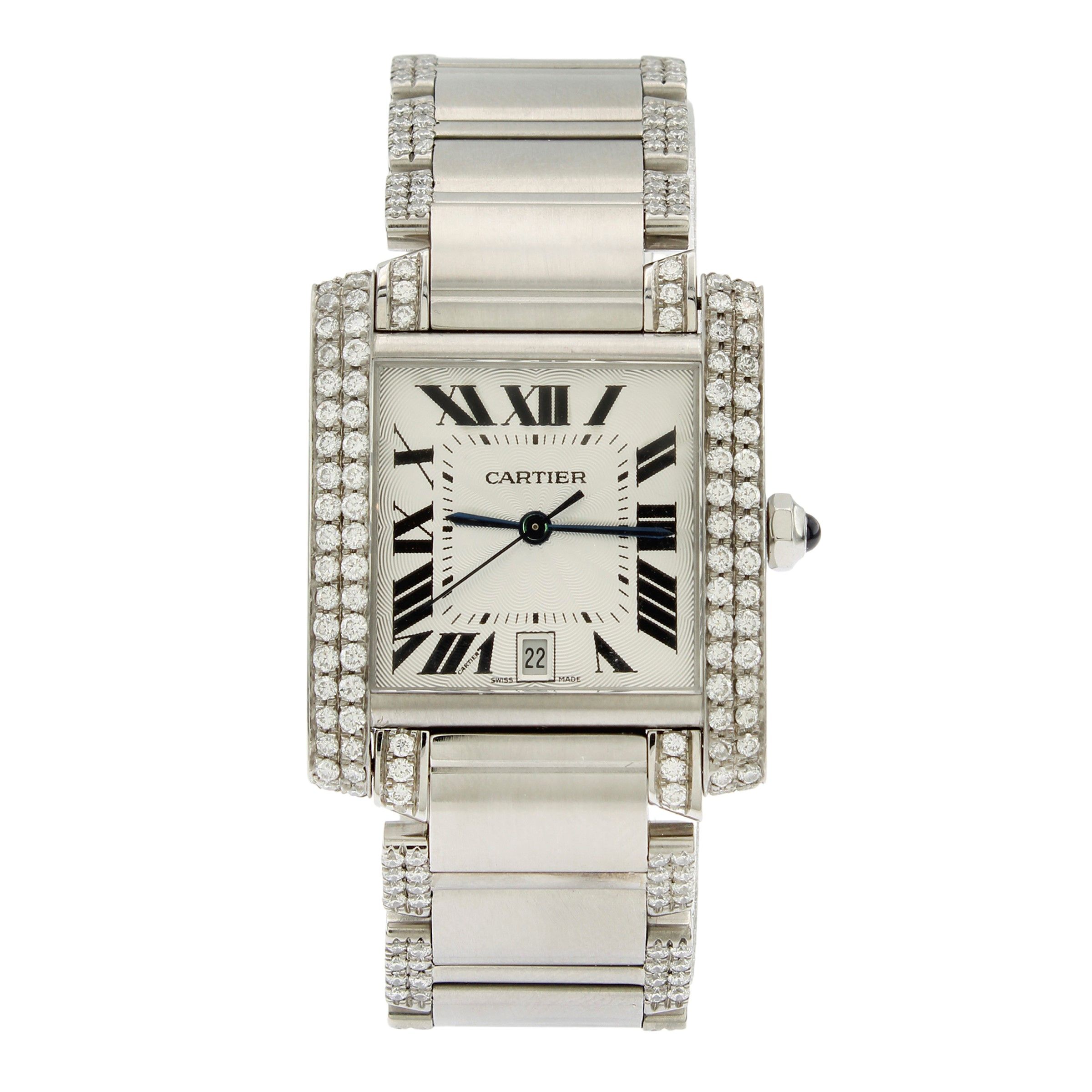 anni 2000 in acciaio, modello grande, ref. 484219QX - 2302, impreziosito da diamanti taglio brillante ct 6 circa, cassa carré 28x32 mm. vetro zaffiro quadrante argentato con numeri romani, vetro zaffiro, movimento al quarzo, bracciale in acciaio e diamanti con chiusura deployante, cassa quadrante e movimento firmati, completo di scatola