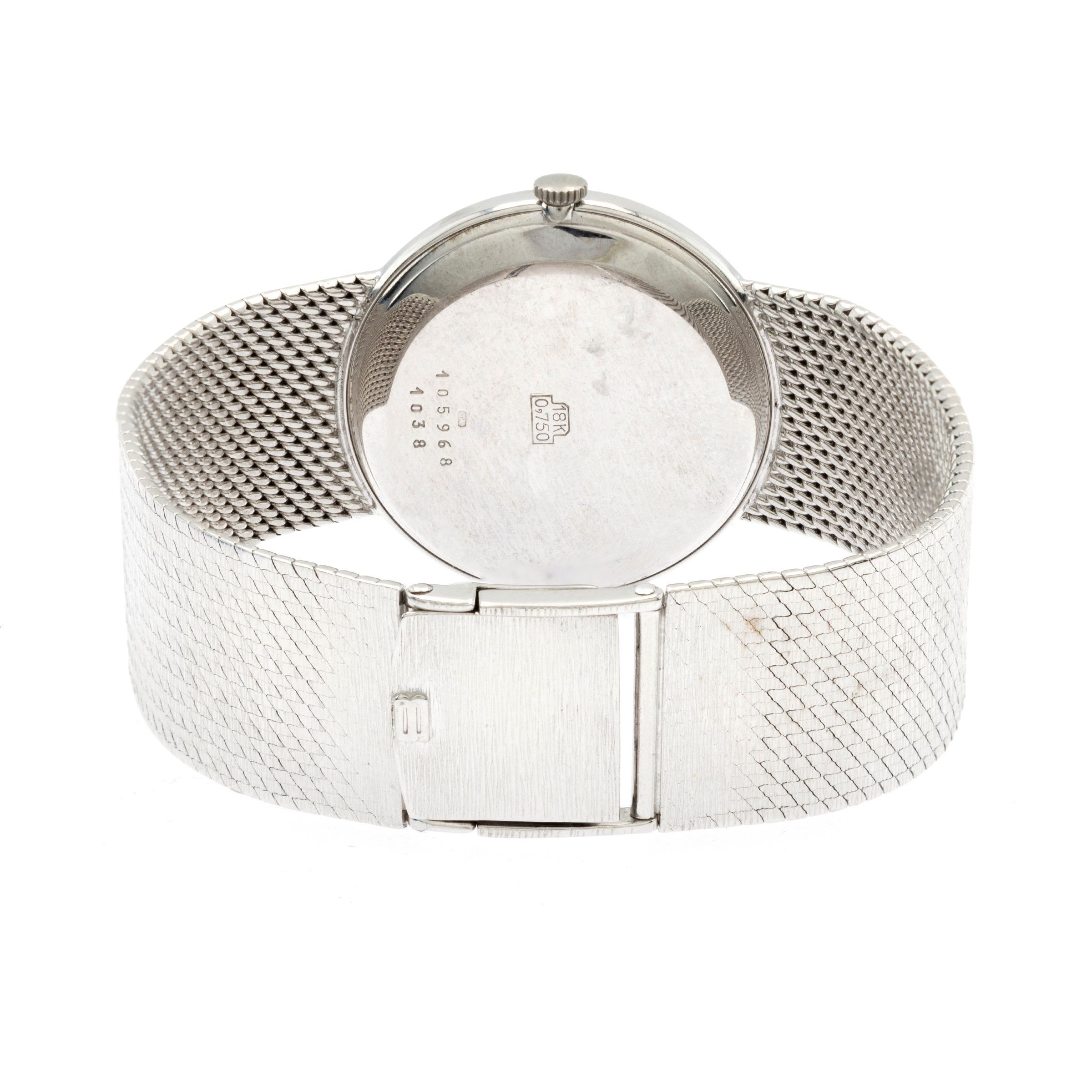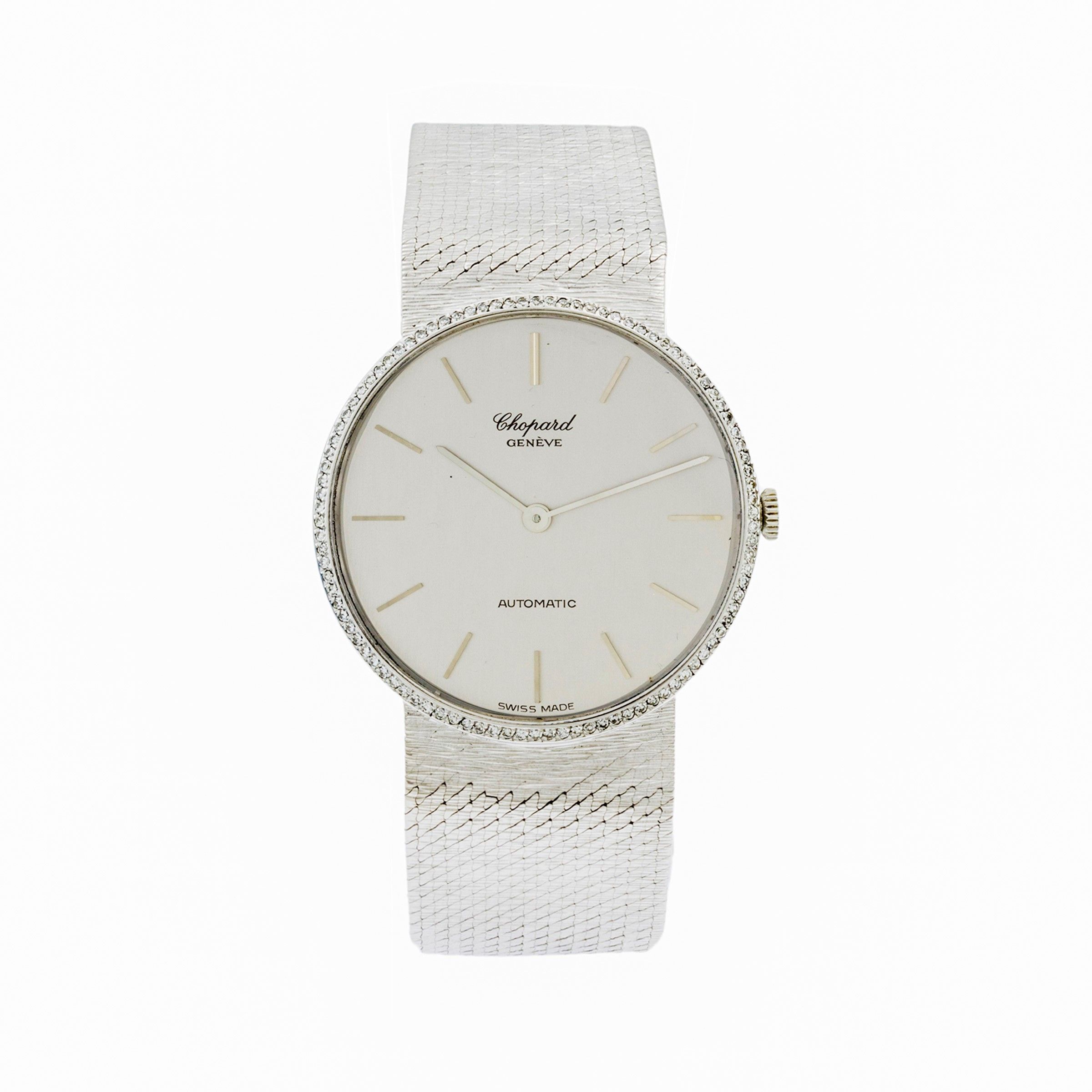 anni 80/90 in oro bianco 18kt, ref. 105968 - 1038, cassa tonda 33 mm. quadrante argentato con indici, ghiera con diamanti taglio huit-huit, vetro zaffiro, movimento meccanico a carica automatica, calibro chopard 2-66, bracciale in oro bianco 18kt, cassa, quadrante e movimento firmati