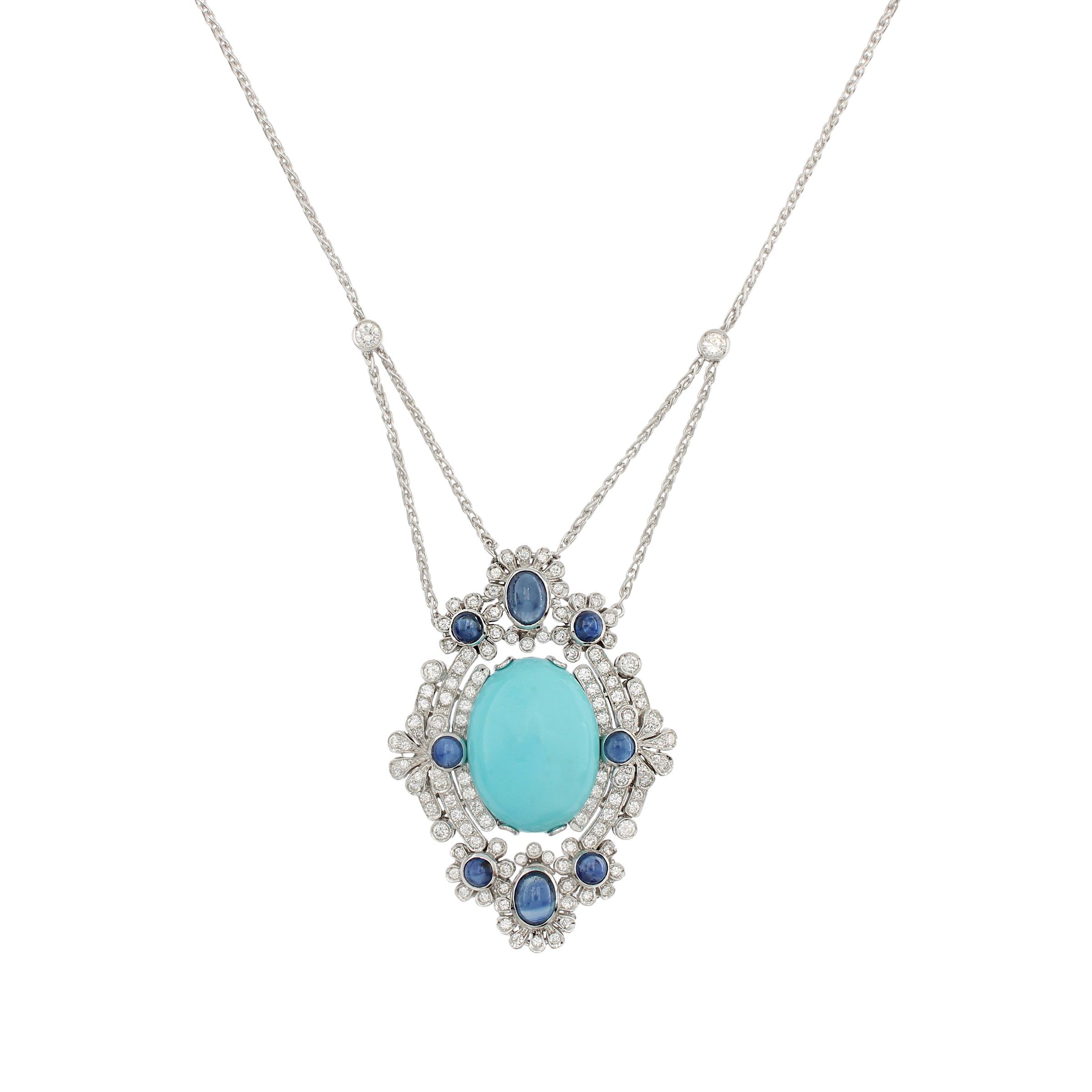 centrata da turchese naturale taglio cabochon, diamanti taglio brillante ct 2,50 circa e zaffiri taglio cabochon ct 2 circa, lunghezza collana 40 cm. - dimensioni pendente 5,1x3,6 cm.
