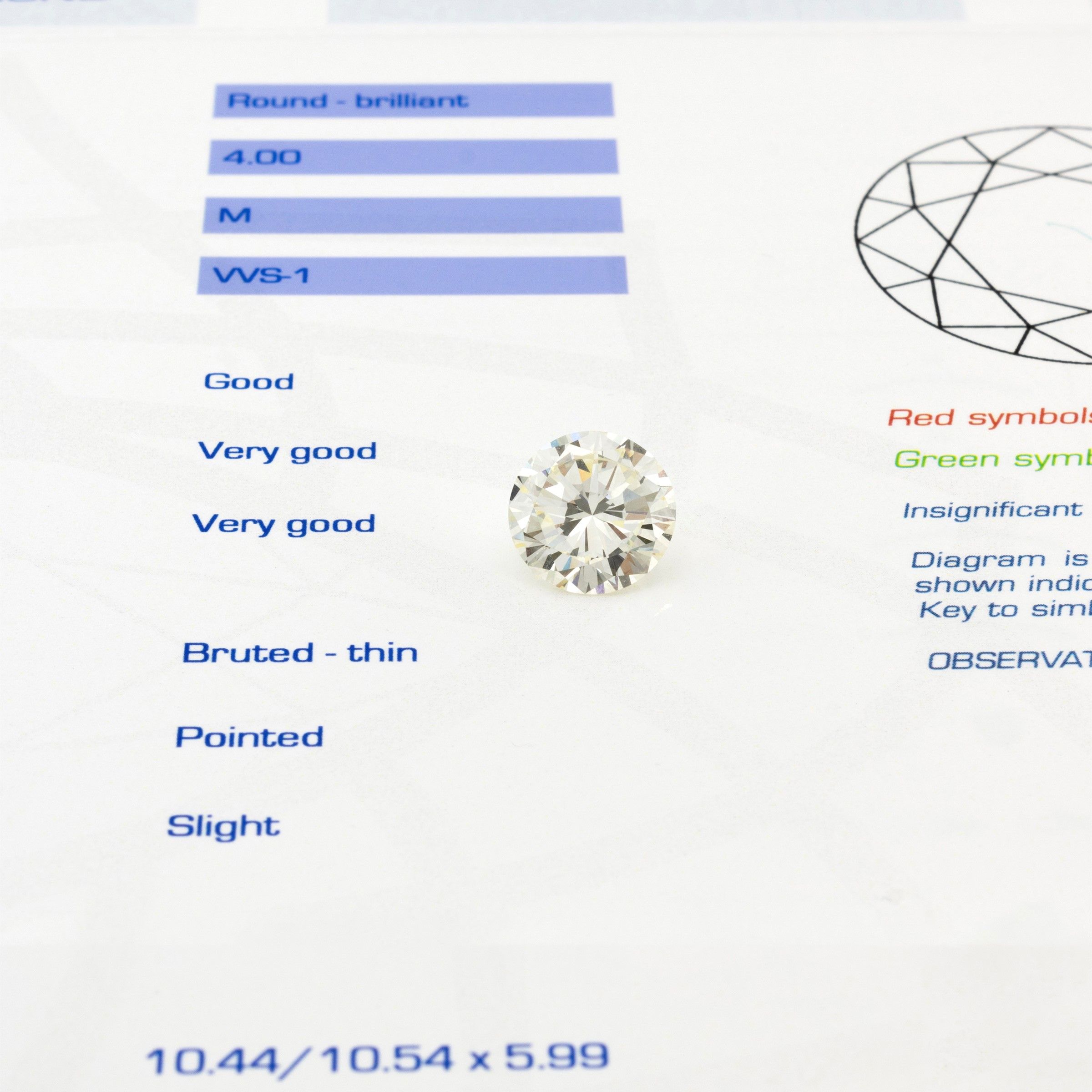 colore M - purezza VVS1, fluorescenza leggera, misure 10.44/10.54x5.99/57.3 mm. completo di certificato gemmologico