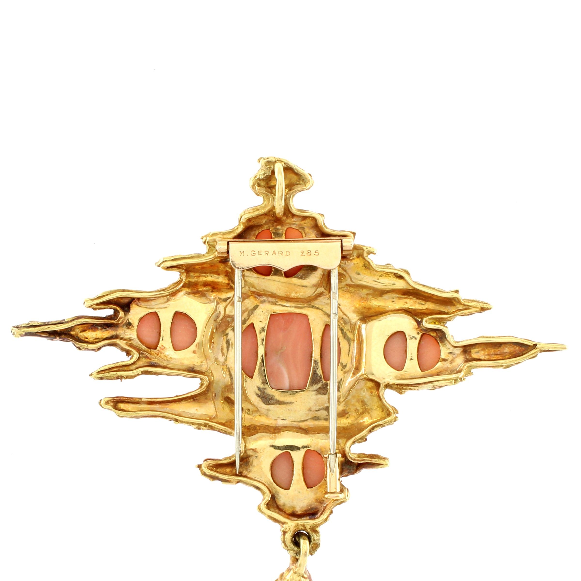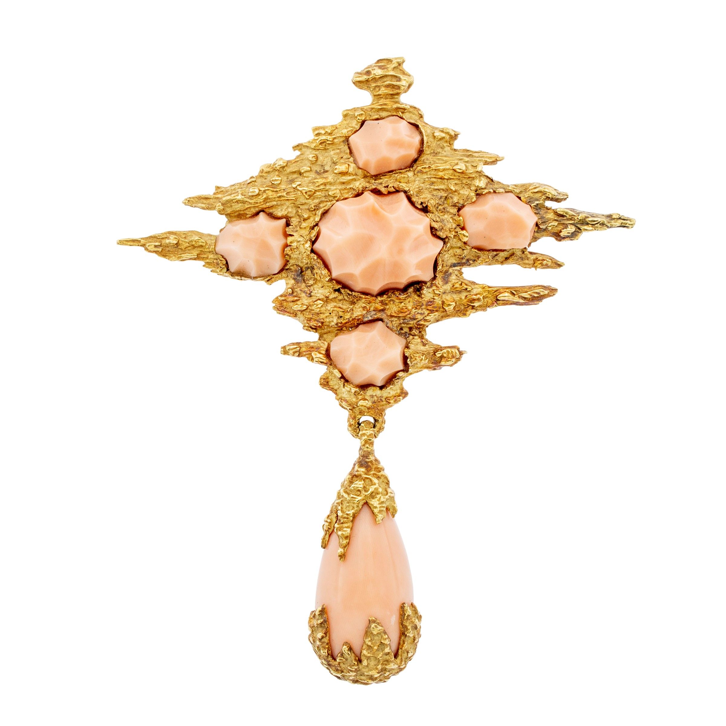 Paris, firmata e numerata, anni 70 circa in oro giallo 18kt e corallo rosa scolpito e a goccia, dimensioni 9,3x8 cm. completo di custodia in pelle